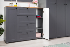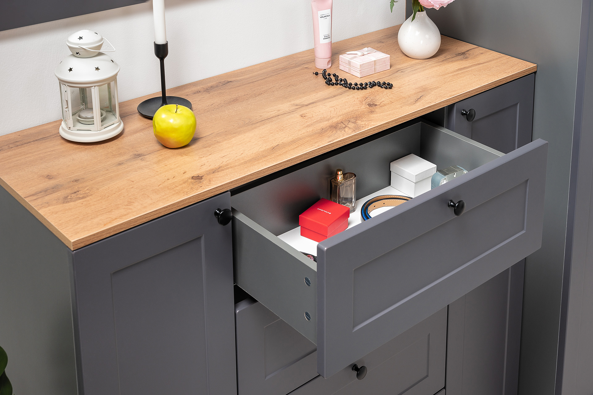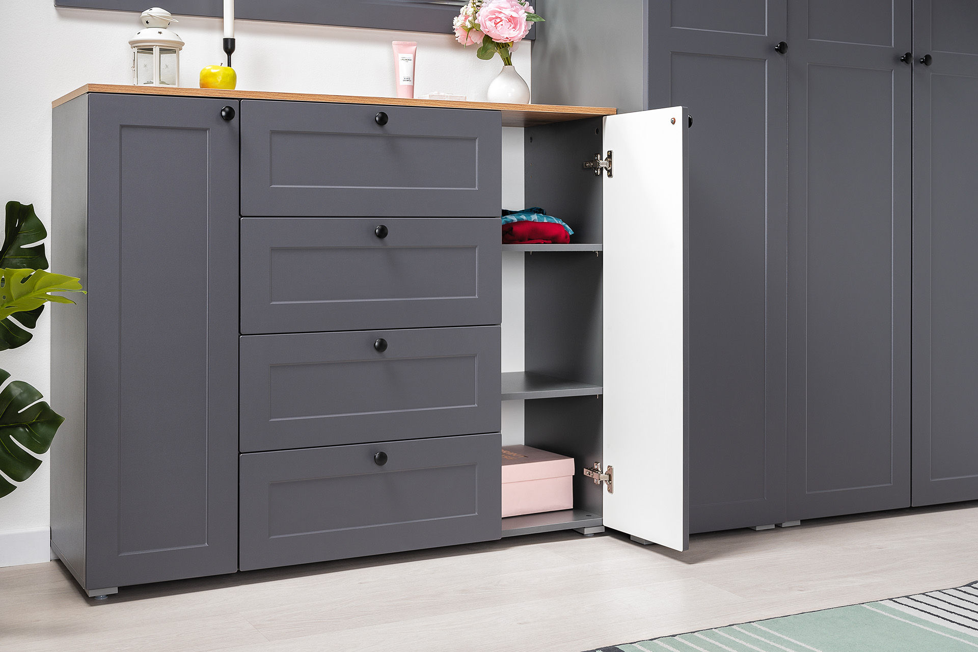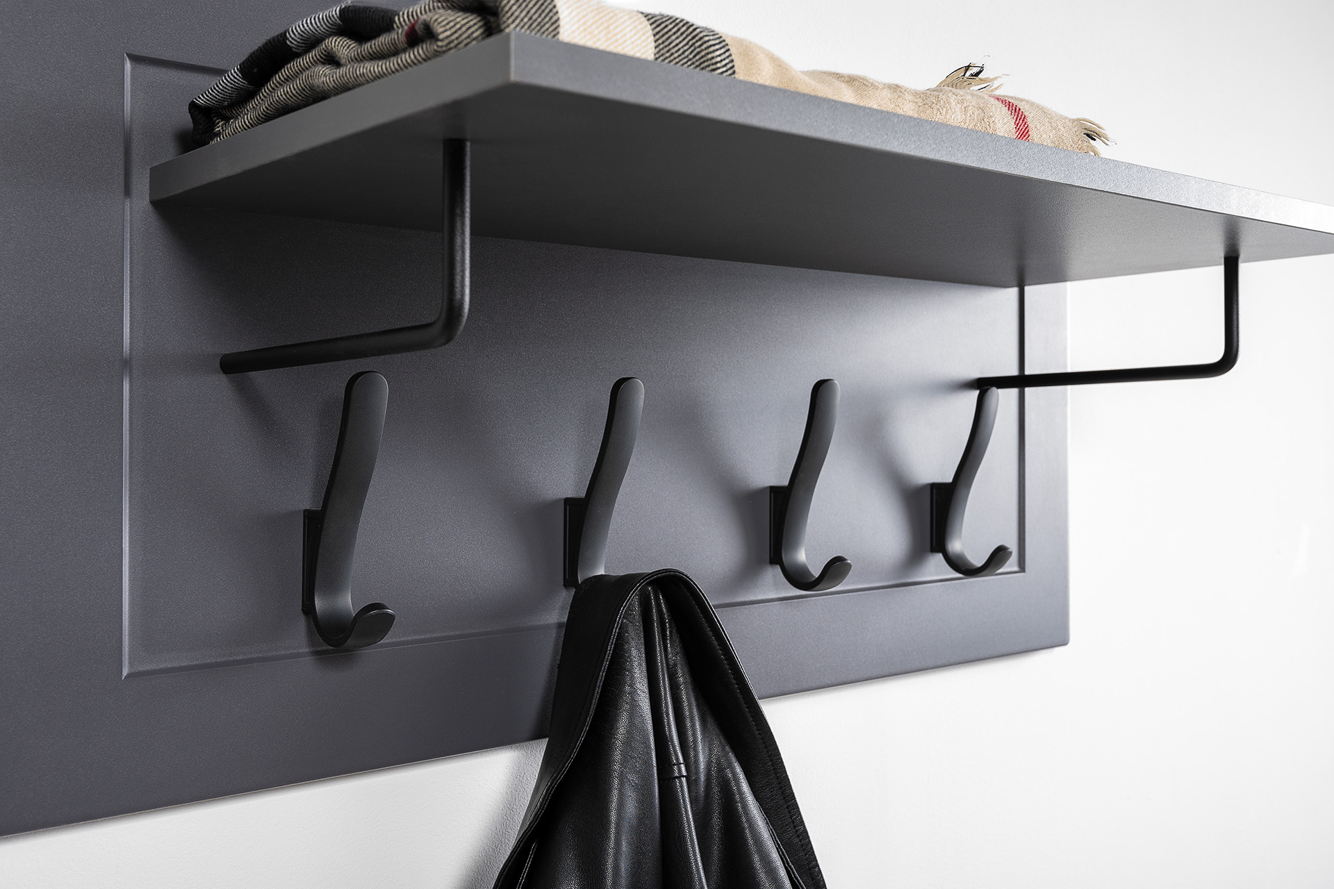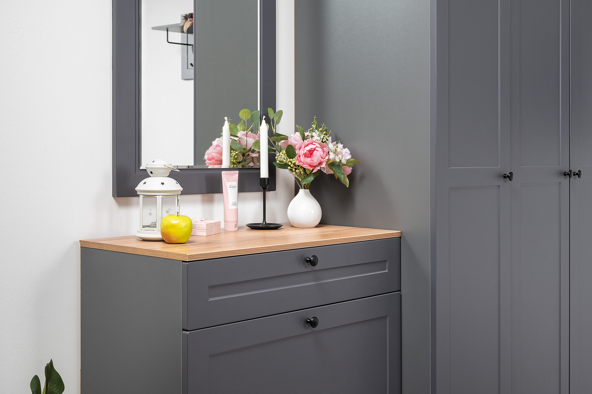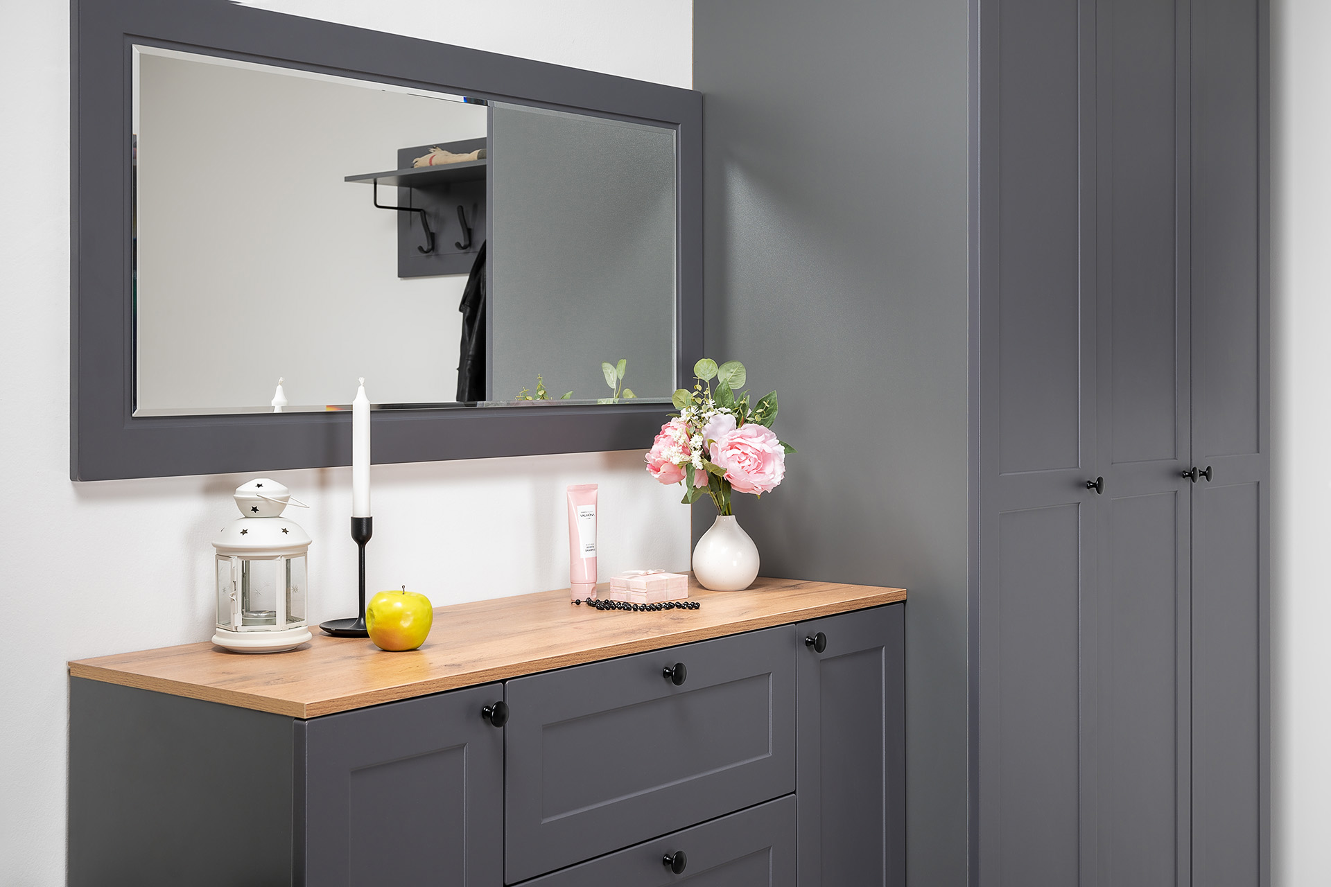 Прихожая доступна в двух цветовых решениях – белый/графит в сочетании с теплым древесным декором.
