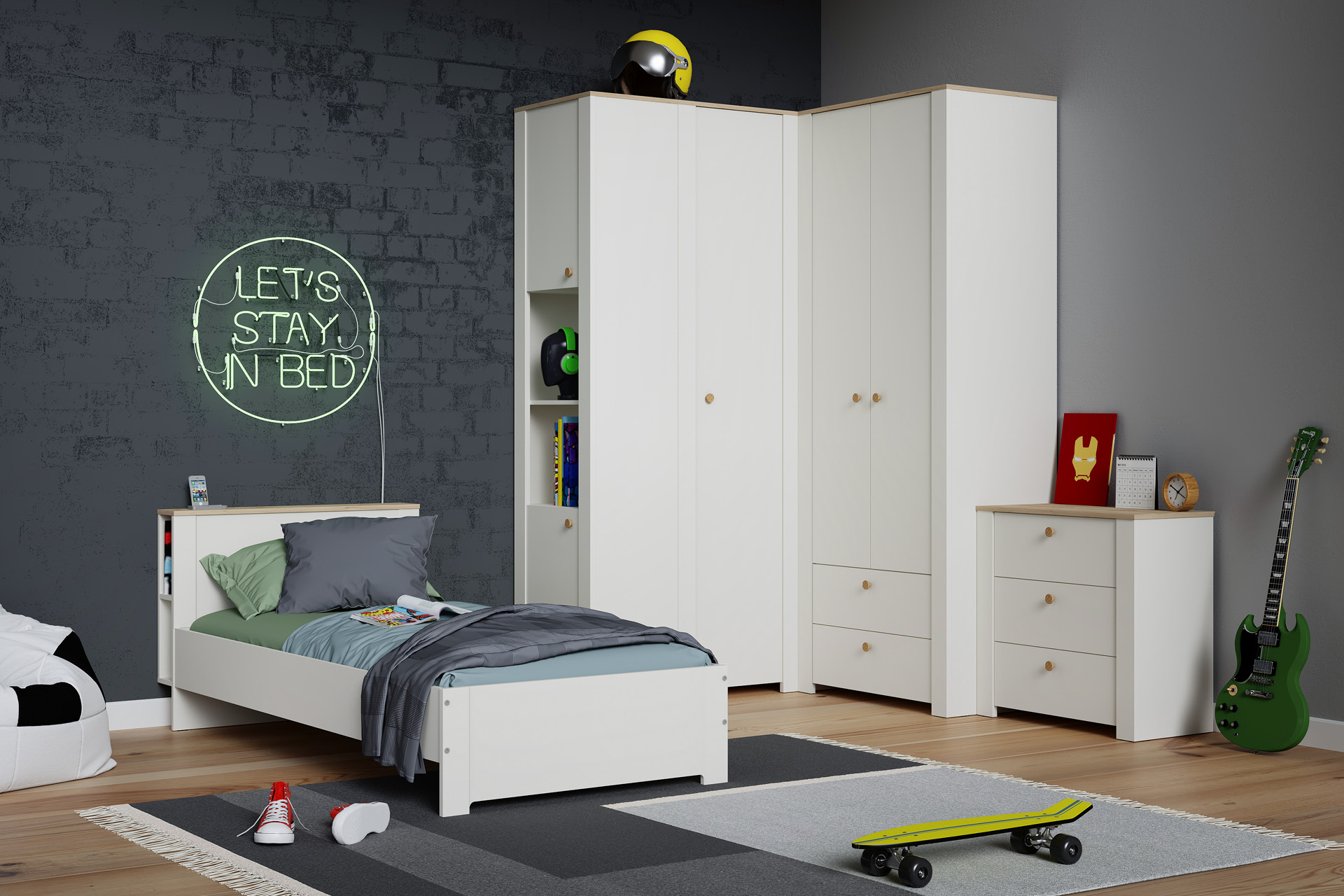Джастин – новинка в скандинавском стиле. Светлая и лаконичная, она станет не акцентом, а идеальным фоном для жизни, учебы, отдыха и игр.