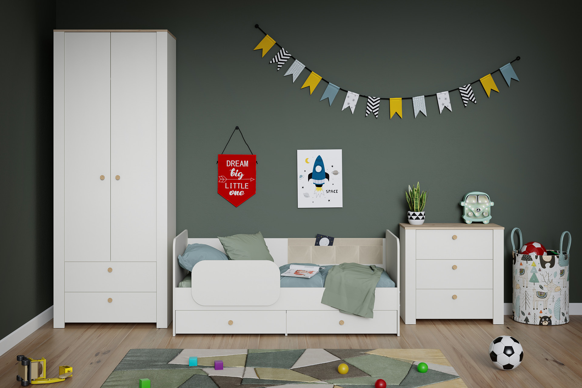 Джастин уникален тем, что подходит для разных возрастных категорий: для малышей – кроватка с защитным бортиком, съемными тканевыми кармашками и выкатными ящиками; для подростков – кровать с полноценным спальным местом и нишей для книг в изголовье; всевозможные модули для хранения. А в ящик письменного стола можно спрятать под замочек свои сокровища и секреты.
