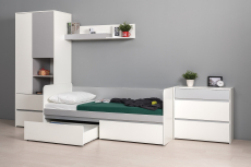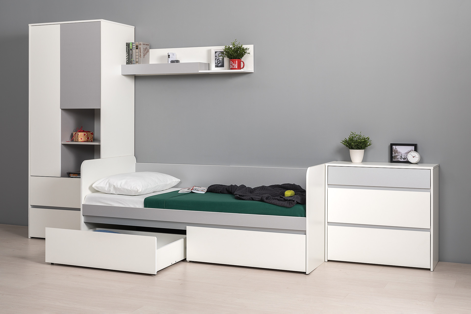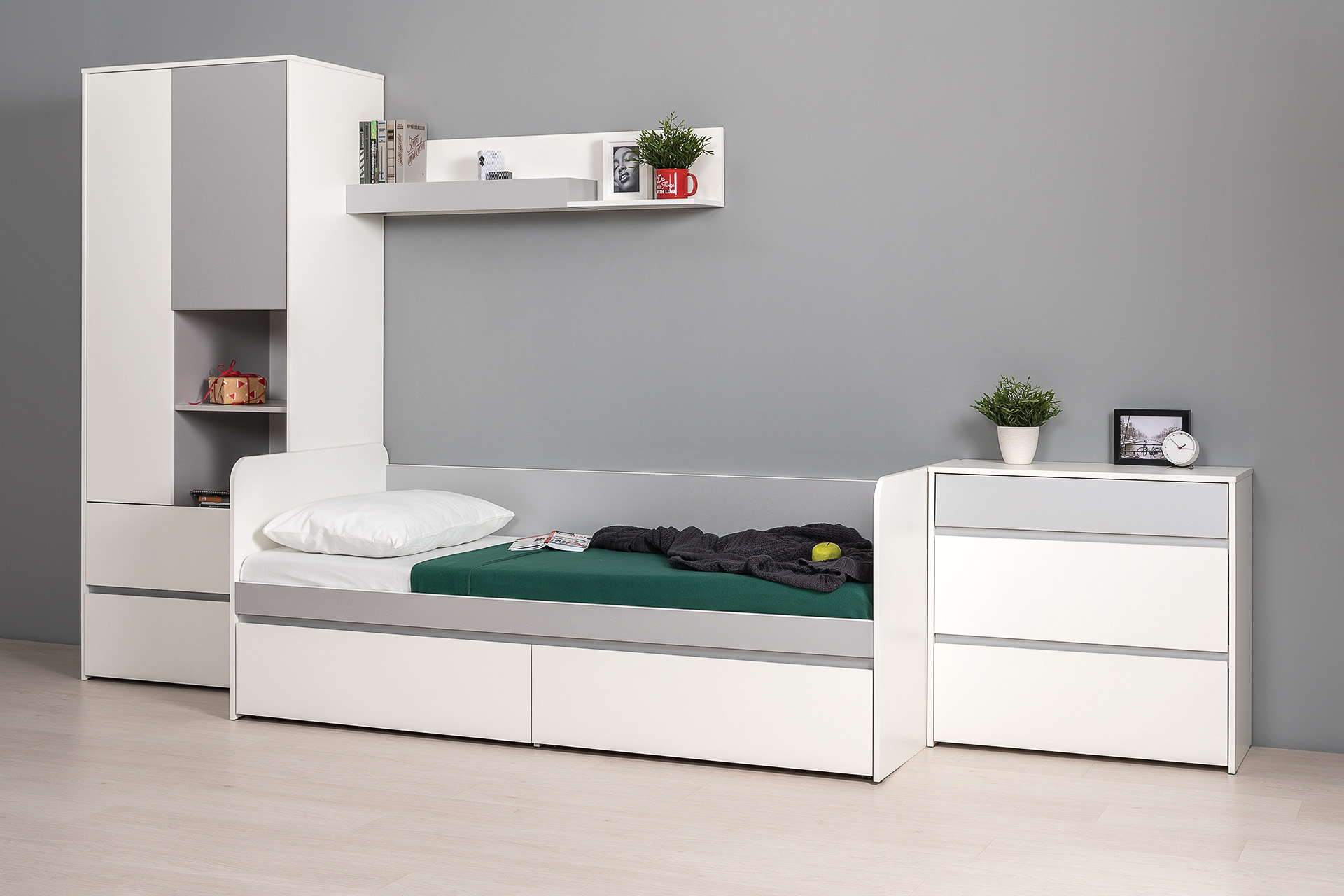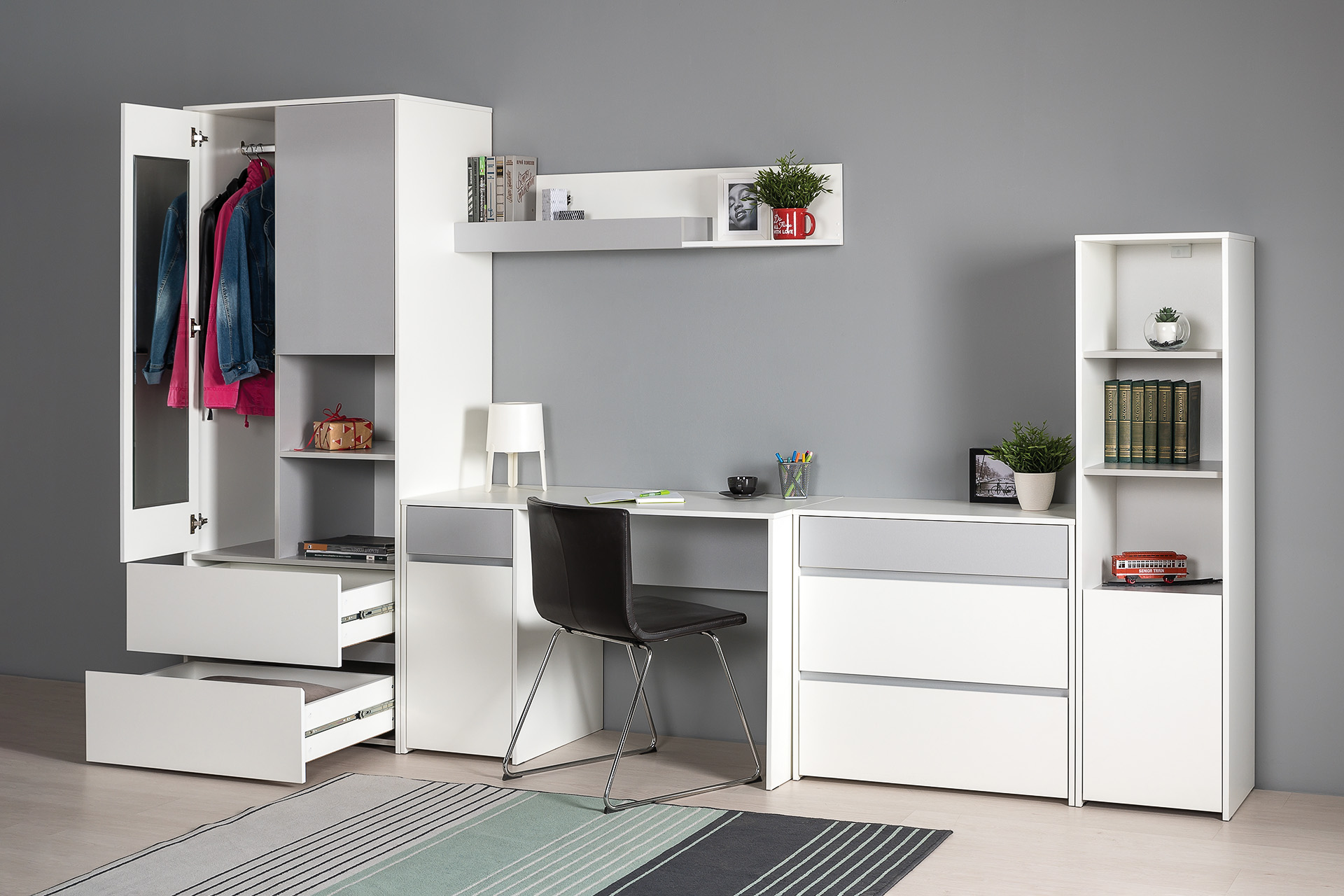 Базовый белый цвет, сочетаясь с акцентным серым, создаёт нейтральную основу интерьера, чтобы подчеркнуть личные вещи и аксессуары.