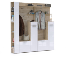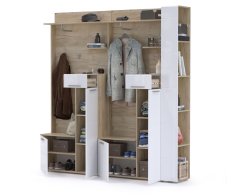 Данная комплектация представлена набором модулей коллекции Лайн, и состоит из двух мини-прихожих и открытого стеллажа. Нарядный дизайн мебели с белым глянцем фасадов смотрится свежо и празднично. Глубина модулей всего 35 см., что позволяет использовать мебель в весьма узких помещениях. Стеллаж Лайн 10.141 располагает четырьмя открытыми полочками, на которых достаточно места для необходимых под рукой мелочей и предметов декора. Модель имеет универсальную сборку, используется как торцевой элемент мебельной композиции и может быть расположен с любой стороны. Мини-прихожая Лайн 10.16 представляет собой панель, комбинирующую открытую вешалку и две распашные тумбы с внутренними полками. Вешалка имеет антресольную полочку для головных уборов, которая закреплена на металлическом полкодержателе, что может использоваться в качестве штанги для развешивания одежды на плечиках. На лицевой панели предусмотрена пара крючков для размещения сумочек или зонтиков и полочка для мелочей. Высокая тумба с ящиком и двумя полками расположена с правой стороны прихожей, низкая с полкой - с левой. Универсальной сборки нет. Данная комплектация включает две одинаковых мини-прихожих, что увеличивает функциональность набора мебели. Все элементы мебели могут быть расположены в любом порядке друг относительно друга, составляя гармоничный комплект для обустройства прихожей. Выполнена мебель в сочетании светлого цвета натурального дуба корпуса из ламинированной ДСП 16 мм, и глянцевых искристо белых МДФ фасадов. Линейная фрезеровка фасадов и периферическая фрезеровка по типу фацета украшают мебель и определяют название коллекции. Фасады закреплены на четырёхшарнирных петлях, выдвижные ящики мебели закреплены на шариковых направляющих полного выдвижения. Установлена на пластиковые опоры высотой 20 мм. Поставляется в разобранном виде, надёжно упакованными, с комплектом фурнитуры и инструкцией по сборке.