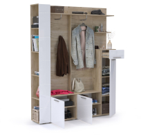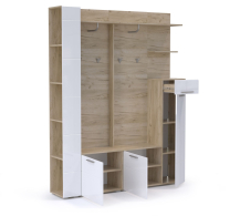 Данная комплектация представлена набором модулей коллекции Лайн, и состоит из стеллажа, тумбы, открытой вешалки и мини-прихожей. Глубина модулей всего 35 см., что позволяет использовать мебель в весьма узких помещениях. Стеллаж Лайн 10.141 располагает четырьмя открытыми полочками, на которых достаточно места для необходимых под рукой мелочей и предметов декора. Модель имеет универсальную сборку, используется как торцевой элемент мебельной композиции и может быть расположен с любой стороны. Открытая вешалка Лайн 15.03 позволяет одежде лучше проветриться, быстрее просохнуть и сохранить форму. Вешалка выполнена в виде настенной панели, имеет антресольную полочку для головных уборов, закреплённую на металлическом полкодержателе. Форма полкодержателя выполнена так, что может использоваться в качестве штанги для развешивания одежды на плечиках. На лицевой панели предусмотрена пара крючков для размещения сумочек или зонтиков. За распашной дверки тумбы Лайн 13.234 расположена одна полочка. Размеры позволяют хранить до 4-х пар невысокой обуви. Удобная высота тумбы, 50 см., позволяет использовать её в качестве подставки для сумок или банкетки для переобувания. Мини-прихожая Лайн 10.16 представляет собой панель, комбинирующую открытую вешалку и две распашные тумбы с внутренними полками. Вешалка имеет антресольную полочку для головных уборов, которая закреплена на металлическом полкодержателе, что может использоваться в качестве штанги для развешивания одежды на плечиках. На лицевой панели предусмотрена пара крючков для размещения сумочек или зонтиков и полочка для мелочей. Высокая тумба с ящиком и двумя полками расположена с правой стороны прихожей, низкая с полкой - с левой. Универсальной сборки нет. Все элементы мебели могут быть расположены в любом порядке друг относительно друга, составляя гармоничный комплект для обустройства прихожей. Выполнена мебель в сочетании светлого цвета натурального дуба корпуса из ламинированной ДСП 16 мм, и глянцевых искристо белых МДФ фасадов. Линейная фрезеровка фасадов и периферическая фрезеровка по типу фацета украшают мебель и определяют название коллекции. Фасады закреплены на четырёхшарнирных петлях, выдвижные ящики мебели закреплены на шариковых направляющих полного выдвижения. Установлена на пластиковые опоры высотой 20 мм. Поставляется в разобранном виде, надёжно упакованными, с комплектом фурнитуры и инструкцией по сборке.