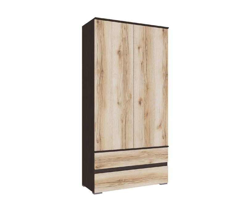 В поисках внместительного шкафа со стандартными габаритами рекомендуем присмотреться к модели из серии Плейона. Двухстворчатый шкаф оснащен выдвижной евроштангой, комплектом полок и двумя выдвижными ящиками.