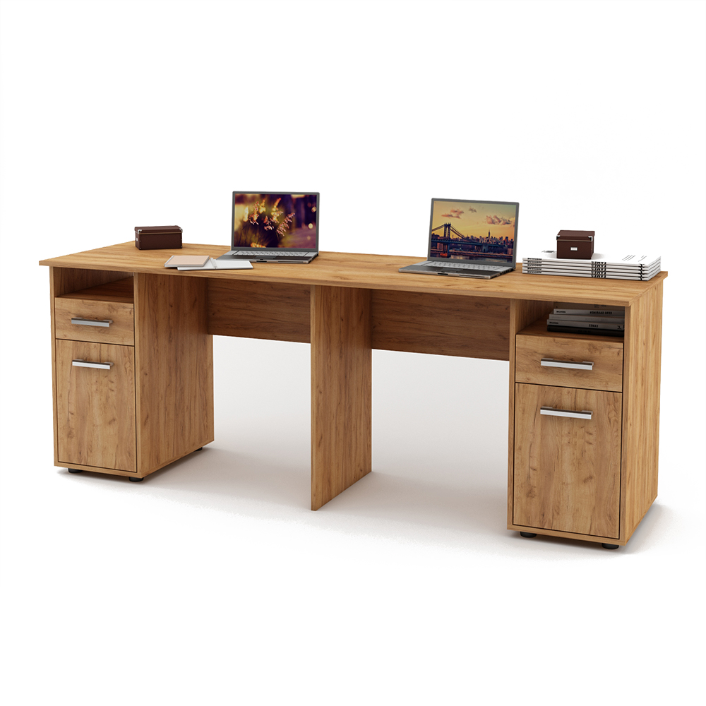 Стол обеспечит рабочими местами сразу двух человек и будет отличным выбором как для небольшого офиса, так и для домашнего интерьера. Стол позволяет вместить все необходимое, при этом не мешая рабочему процессу.