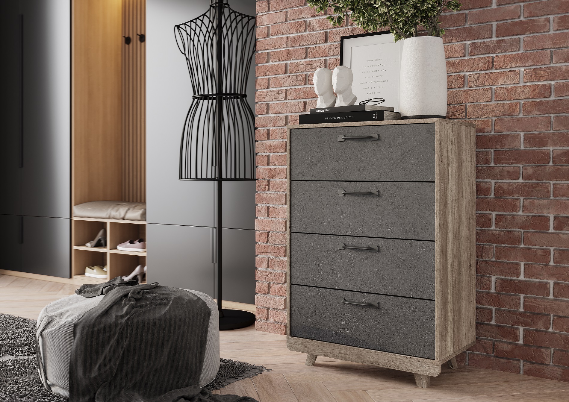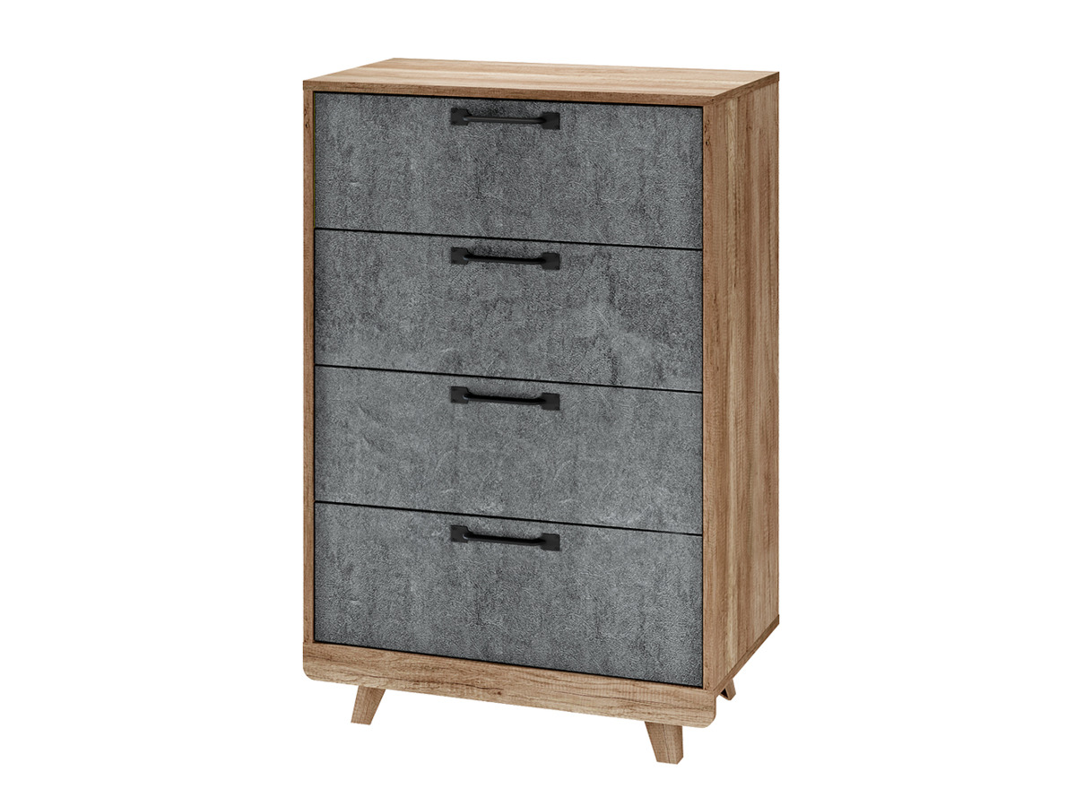 Отличительная черта комодов серии Мегаполис – сочетание теплого оттенка дерева и фотопечати с трендовым рисунком. На таких поверхностях не видно пыли и грязи, что является огромным плюсом для домохозяек. Модель КМ-02 имеет четыре ящика на шариковых направляющих.