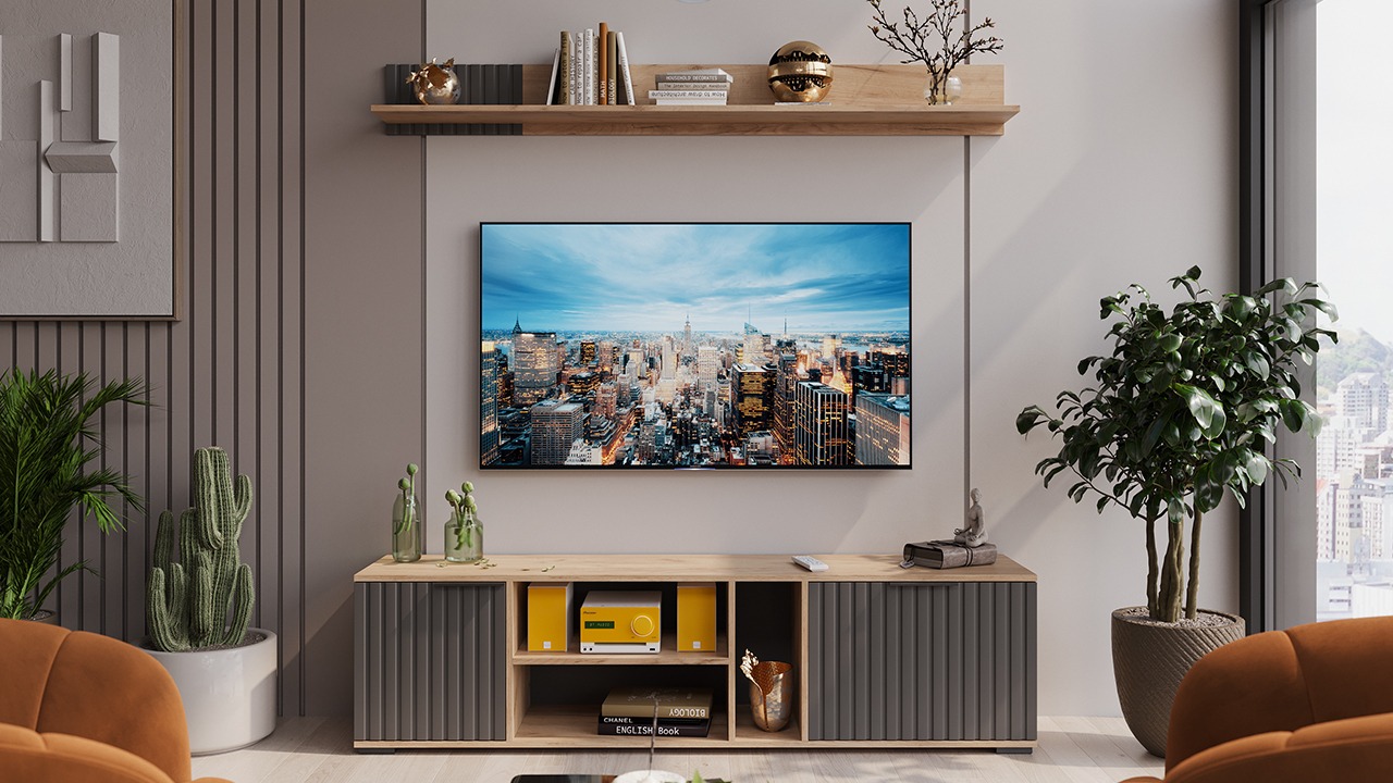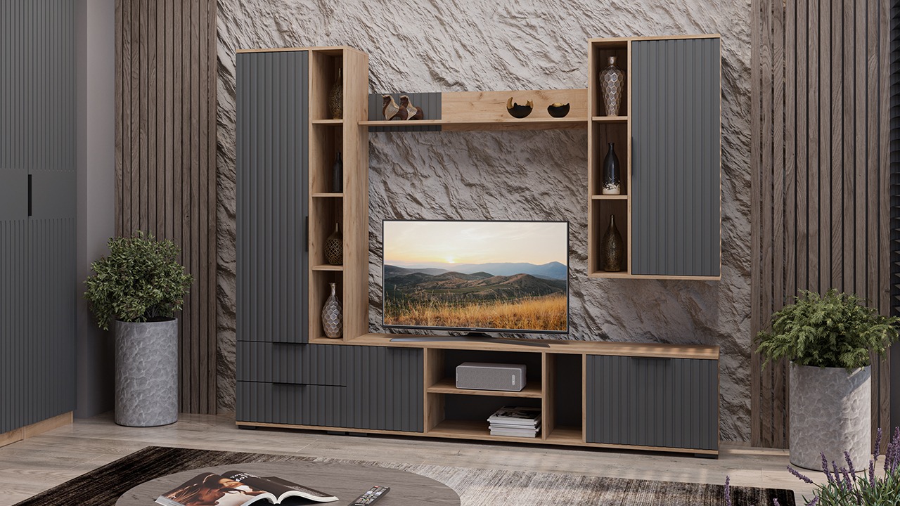 Неоспоримое преимущество различных ТВ тумб "Хилтон" — эргономичность, презентабельность и функциональность, которую им гарантирует наличие открытых и закрытых ниш. Полка, расположенная в центре модели остается открытой, что делает ее подходящим решением для размещения аудио- и видеотехники, а открытые настенные полки, которые размещаются над ТВ тумбой, позволят вам расставить любимые элементы декора и сувениры. Подвесной шкаф и напольные шкафы разной высоты предназначены для размещения книг, посуды и других предметов, а фрезерованные фасады с геометрической точностью линий прекрасно дополняют образ всей коллекции.