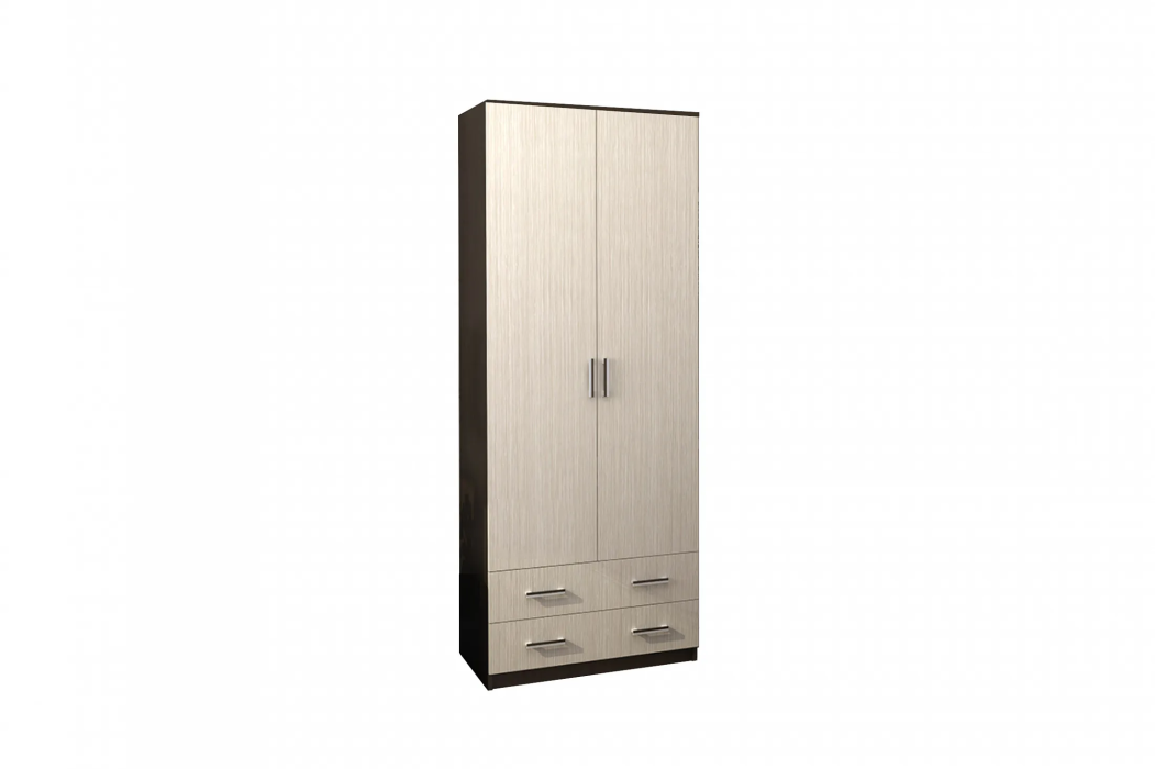 Шкаф оснащен двумя отделениями с полками и двумя выдвижными ящиками, что позволяет удобно разместить все необходимые вещи. В комплекте имеется вся необходимая фурнитура и инструкция по сборке товара, что делает процесс установки быстрым и простым.