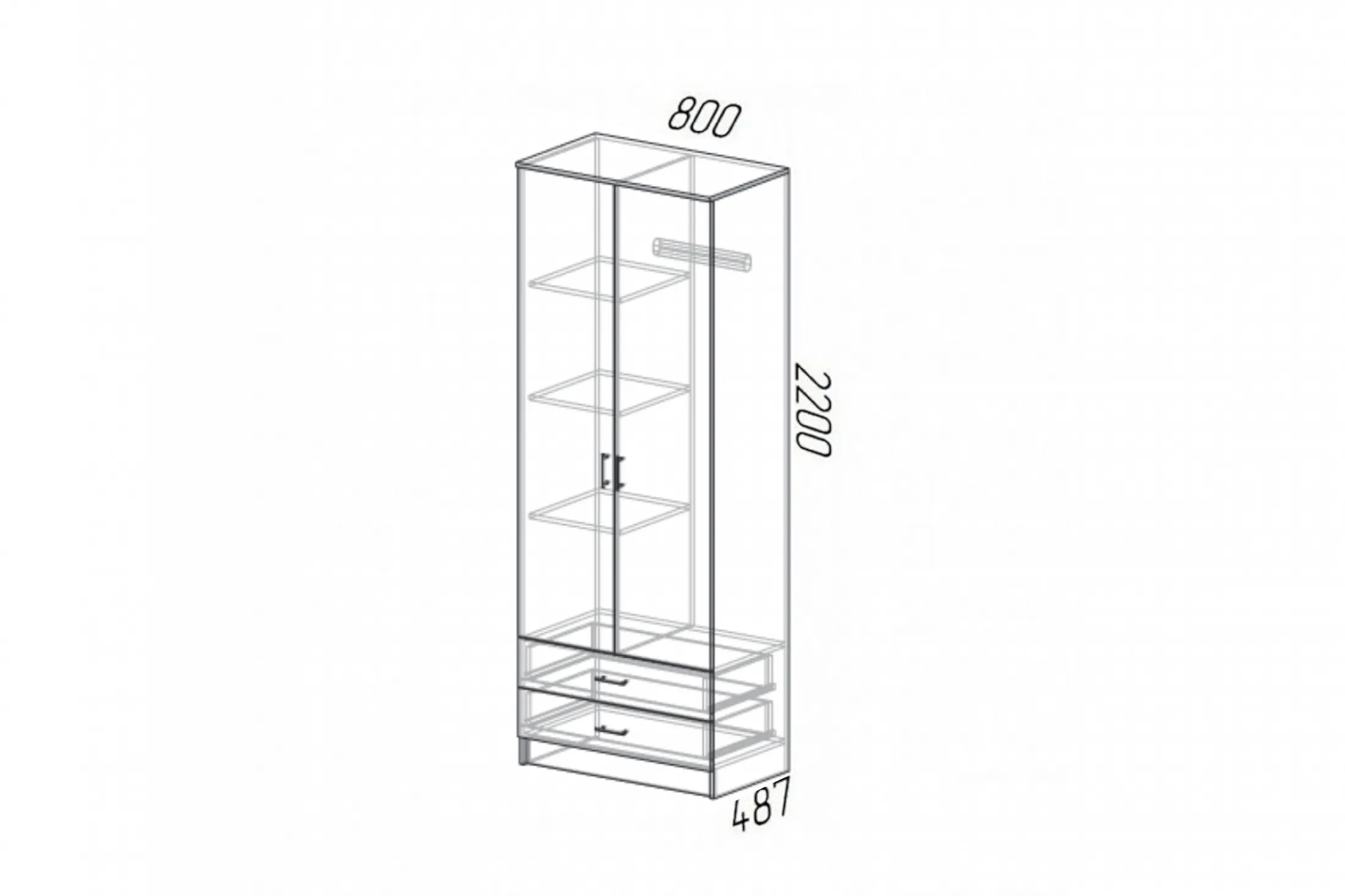 Шкаф оснащен двумя дверями, открывающимися в стороны, что обеспечивает удобный доступ к содержимому. Внутри шкафа расположены четыре полки и штанга для вешалок, что позволяет максимально эффективно использовать пространство.