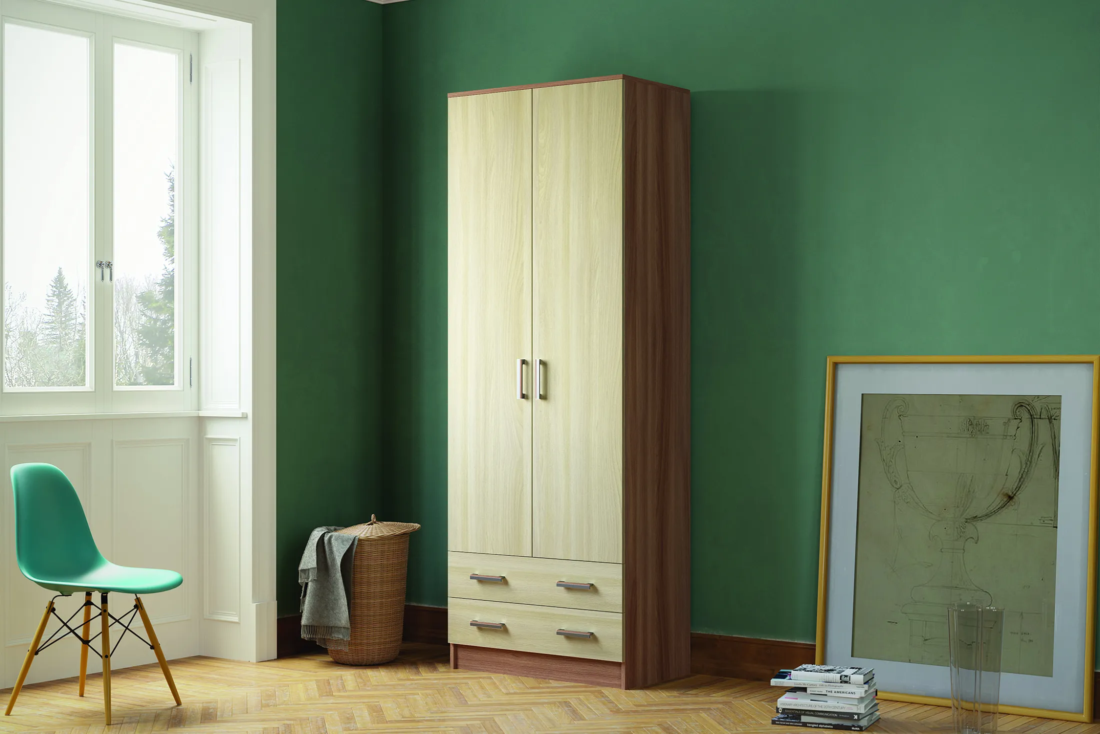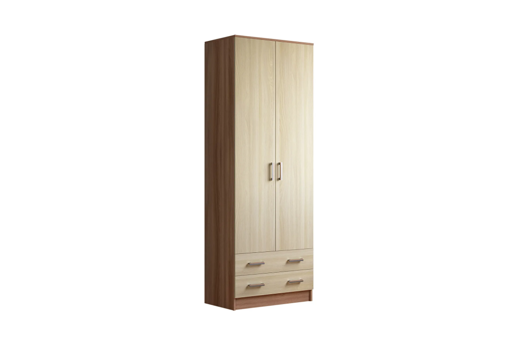 Шкаф оснащен двумя дверями, открывающимися в стороны, что обеспечивает удобный доступ к содержимому. Внутри шкафа расположены четыре полки и штанга для вешалок, что позволяет максимально эффективно использовать пространство.