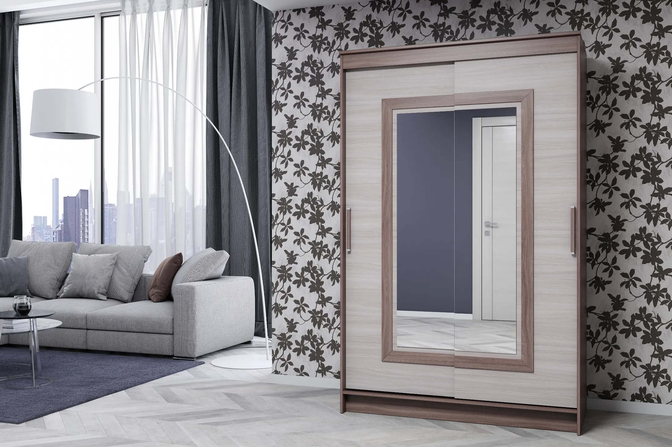 Особенностью шкафа является его конструкция. Он выполнен в прямом стиле, что позволяет максимально эффективно использовать пространство комнаты. Шкаф оборудован двумя раздвижными дверями, которые открываются в стороны, обеспечивая удобный доступ к содержимому.