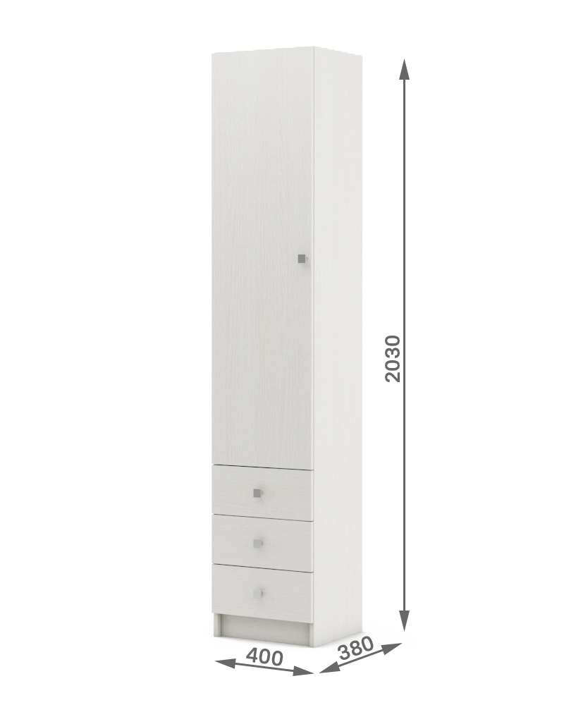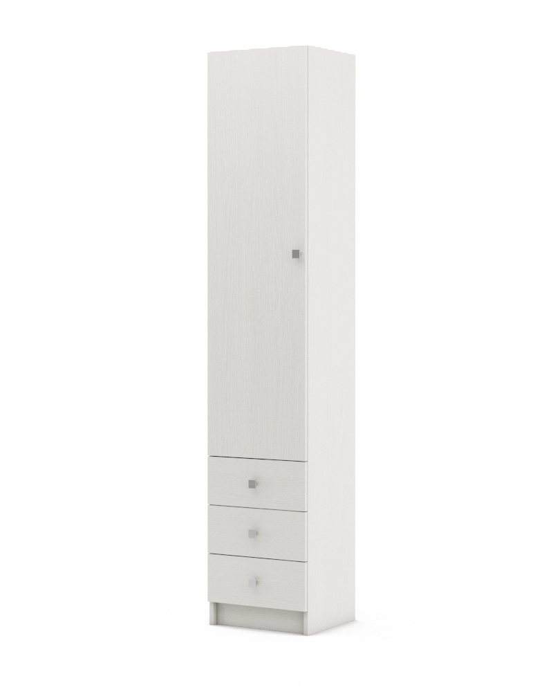 Функциональность: Шкаф оснащен распашным отделением с четырьмя полками и тремя выдвижными ящиками, что позволяет удобно разместить одежду и мелкие вещи.