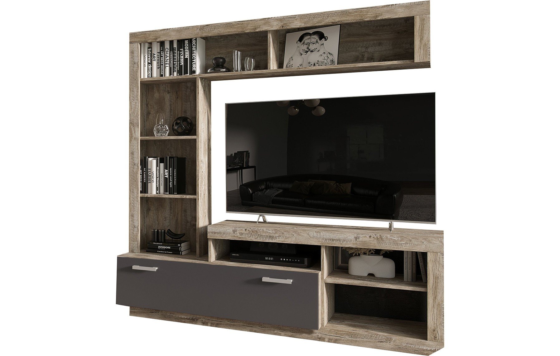Ангара Центральная секция мини-стенка с тумбой ТВ (откидная дверца и ниши), стеллажом и секцией с полками. Материал ЛДСП.