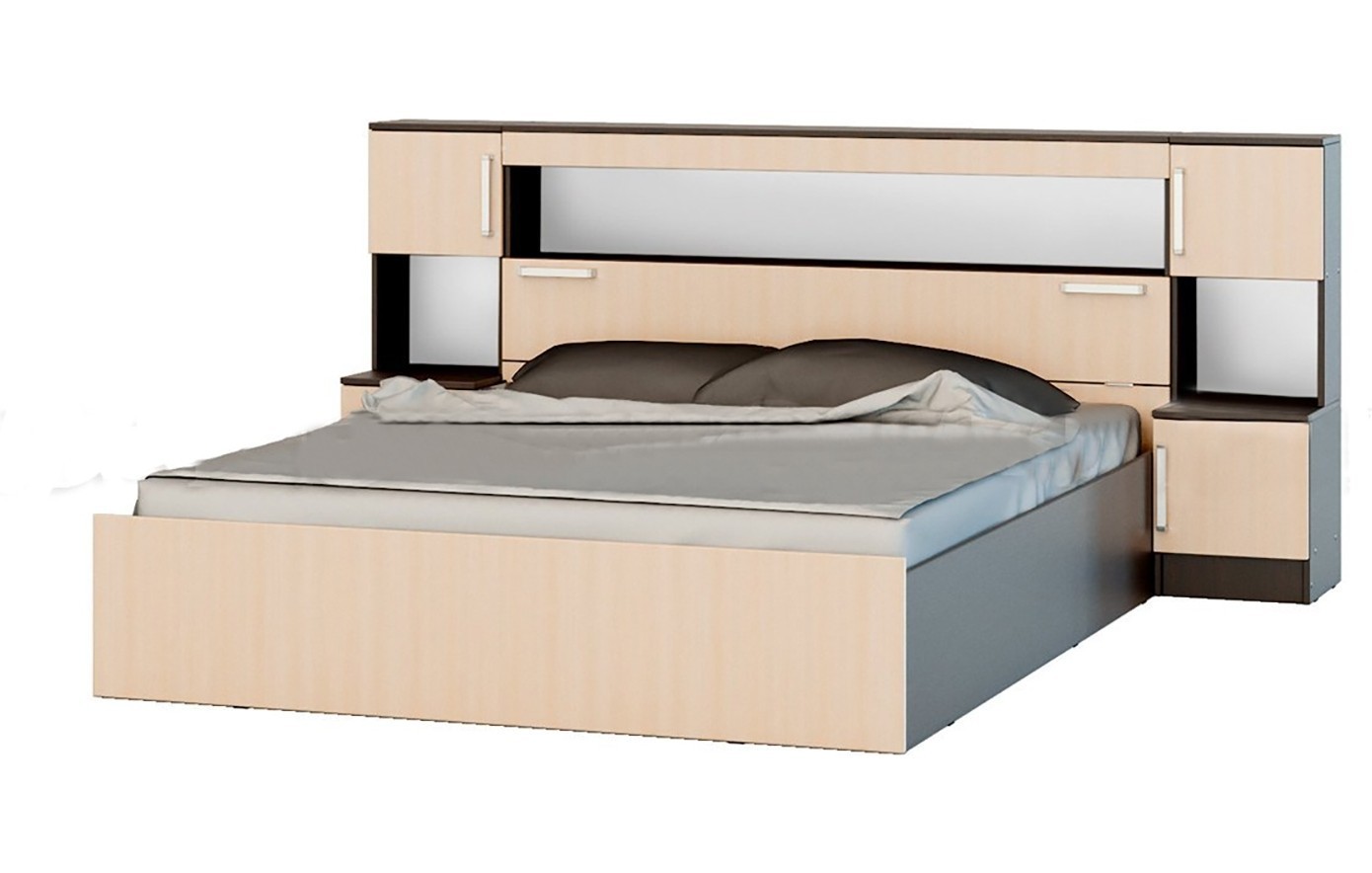 Кровать Бася с надстройкой стильная модель современной кровати с надстройкой, оборудованной секцией для белья за откидной дверью, нишей и двумя прикроватными тумбами с надстройкой.