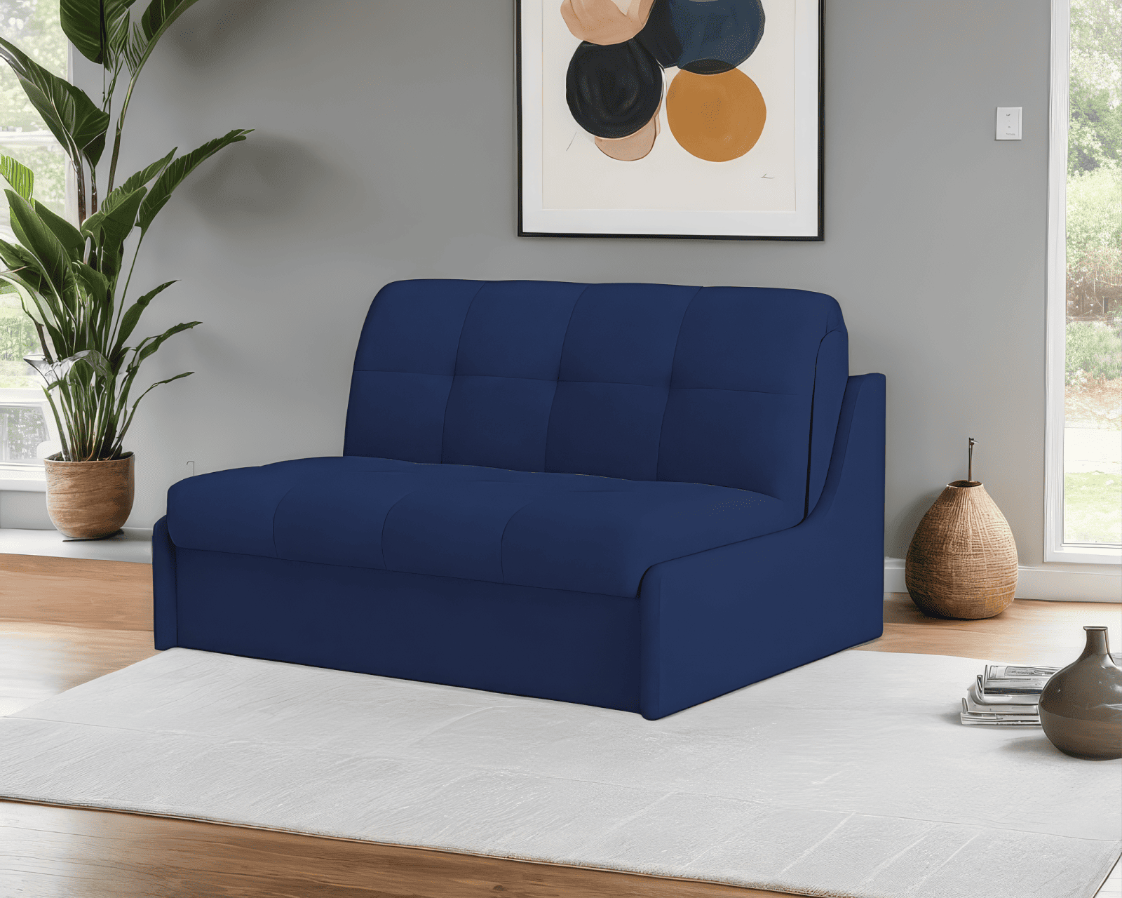 Модель выполнена без подлокотников, что увеличивает полезную площадь дивана, создавая дополнительное пространство для тела. Отсутствие подлокотников повышает удобство при очистке дивана, так как не нужно убирать загрязнения между ними.
