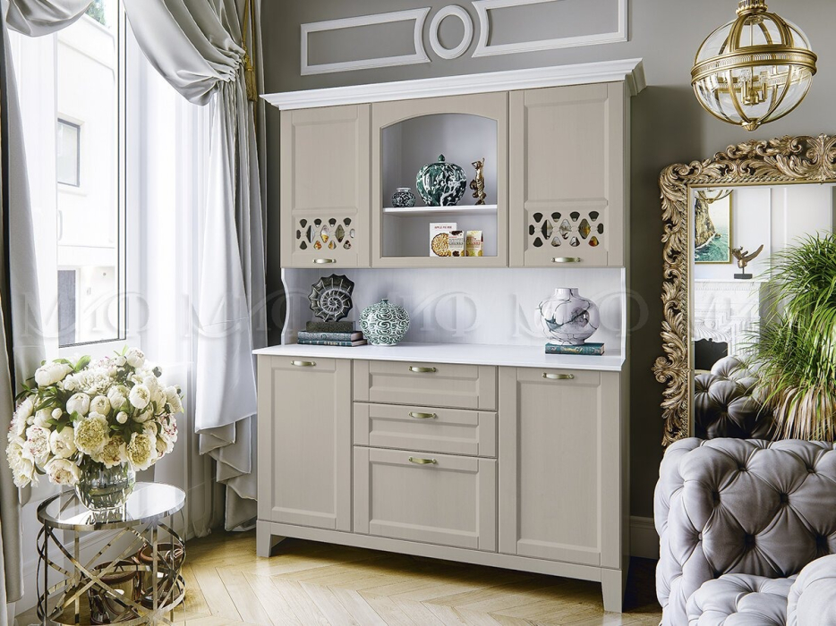 Буфет Милано это удобная мебель для кухни или столовой. Его можно поставить даже в гостиную в загородном доме. Буфет имеет верхнюю витринную часть и нижнюю тумбу с закрытыми фасадами и выдвижными ящиками. Сочетание буфета и кухни прекрасно гармонируют в большом помещении.
