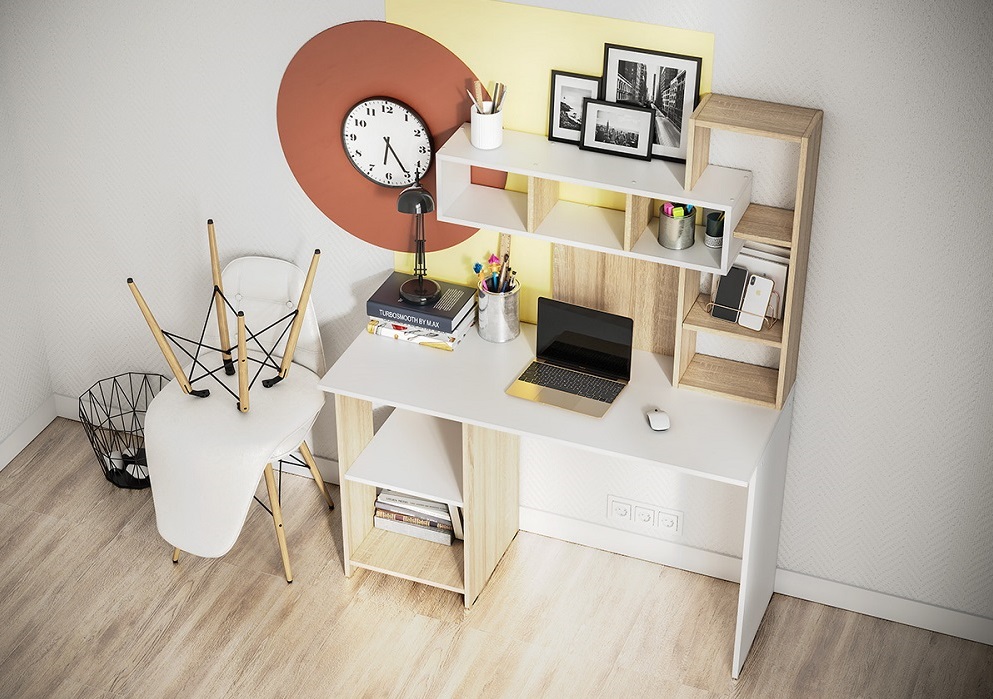 Компьютерный стол Олимп отличается обилием открытых зон хранения и стильно смотрится в современной обстановке.