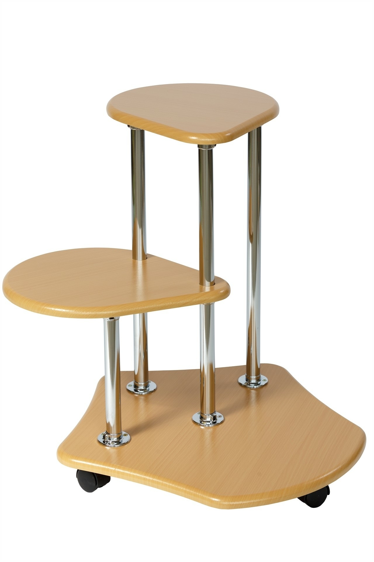 Данная модель предназначена для двух цветочных горшков. Основание и полки выполнены из материала МДФ 16 мм, опоры – хромированная труба. Высота цветочницы 600 мм, ширина 550 мм. Размер полки 385*300 мм. Подставка мобильна благодаря основанию на колесной опоре.