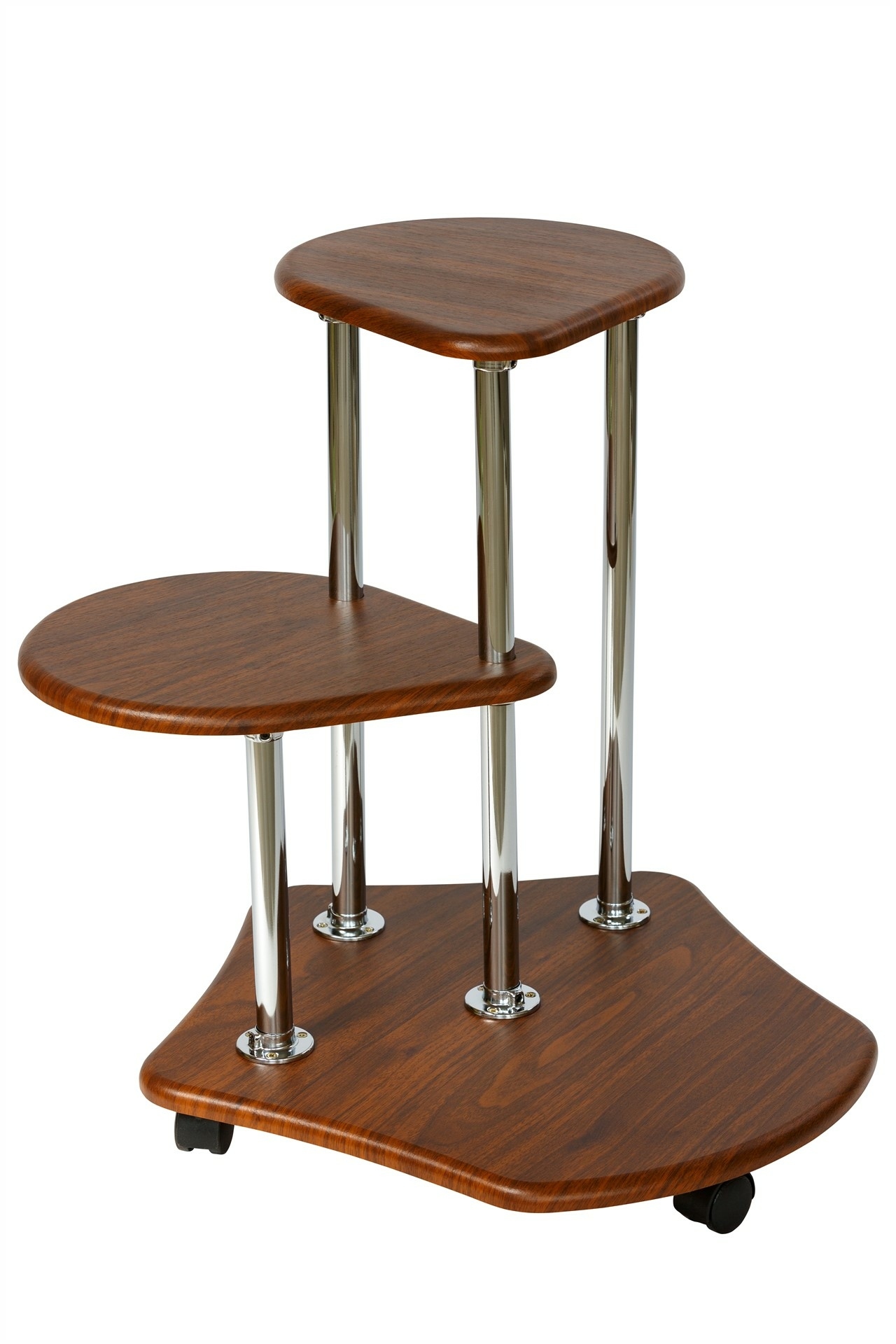 Данная модель предназначена для двух цветочных горшков. Основание и полки выполнены из материала МДФ 16 мм, опоры – хромированная труба. Высота цветочницы 600 мм, ширина 550 мм. Размер полки 385*300 мм. Подставка мобильна благодаря основанию на колесной опоре.