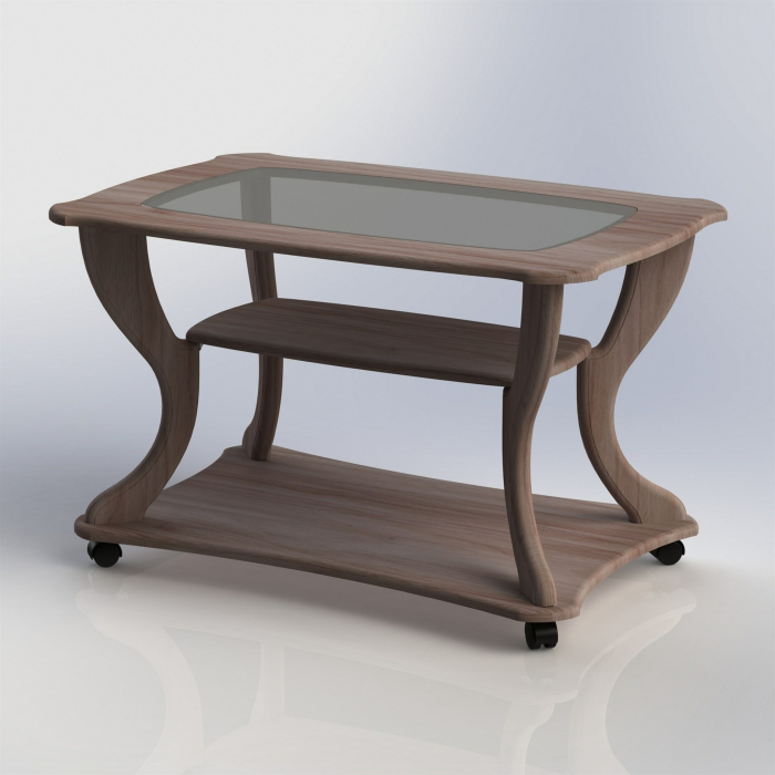 Журнальные столы со стеклянной столешницей несомненно будут украшением любой гостиной. Данная модель журнального стола - это прекрасный вариант для любого интерьера. Особую грацию столику придает столешница со стеклянной вставкой из матового или тонированного стекла (толщина 4 мм) в зависимости от цвета изделия. Матовое стекло используется при производстве столов в цвете дуб, венге, слива, тонированное-бук, ольха, вишня, орех.Стол дополнен полкой длиной 600 мм, шириной 300 мм и основанием на колесной опоре, что позволит легко перемещать его по комнате. Размер столешницы: длина 900 мм, ширина 600 мм, высота стола 560 мм.