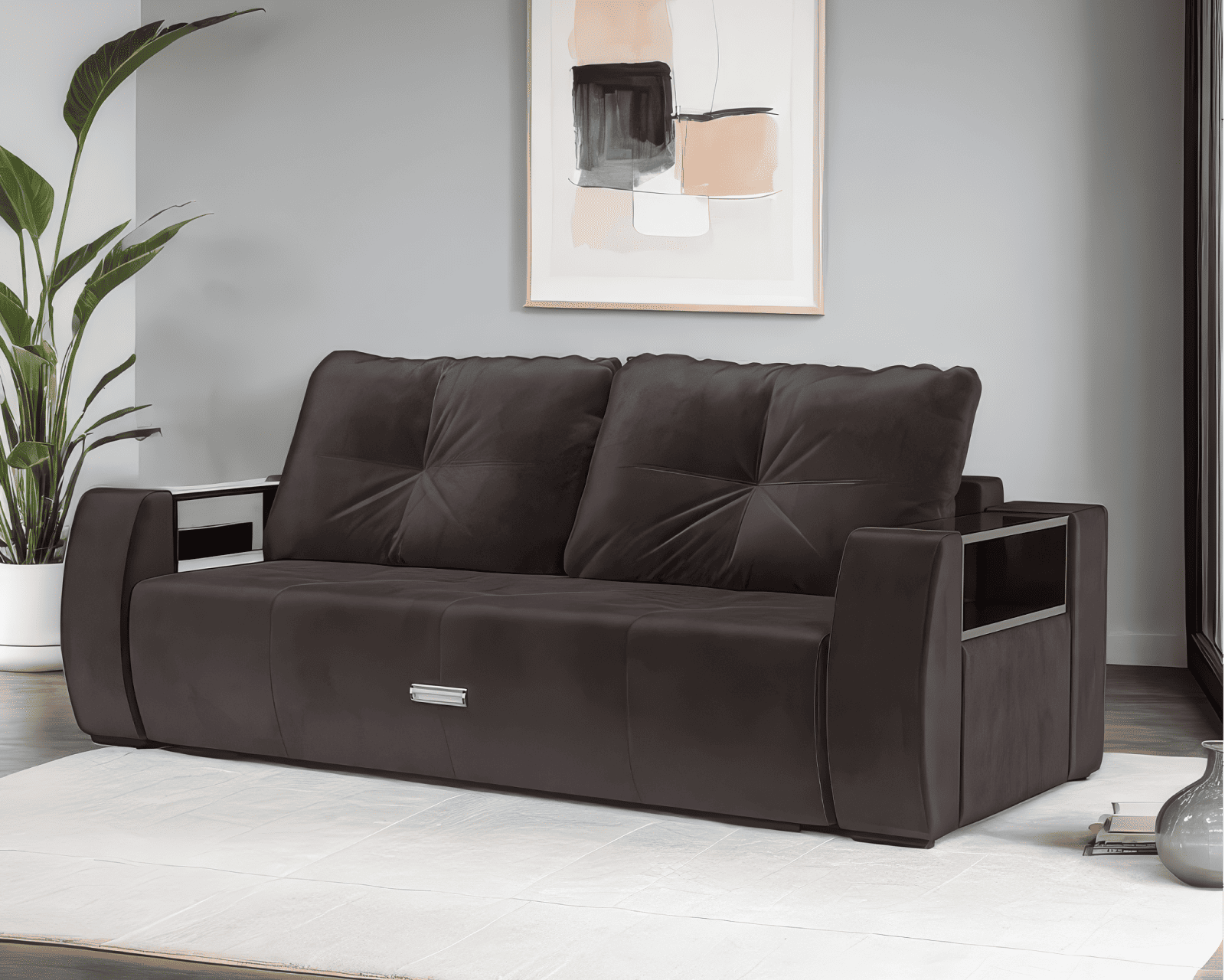 Отличительной особенностью дивана «Мальтида» выступает наличие каркасных подлокотников, образующих дополнительные подставки, что удобно для любителей пить кофе перед просмотром телевизора.