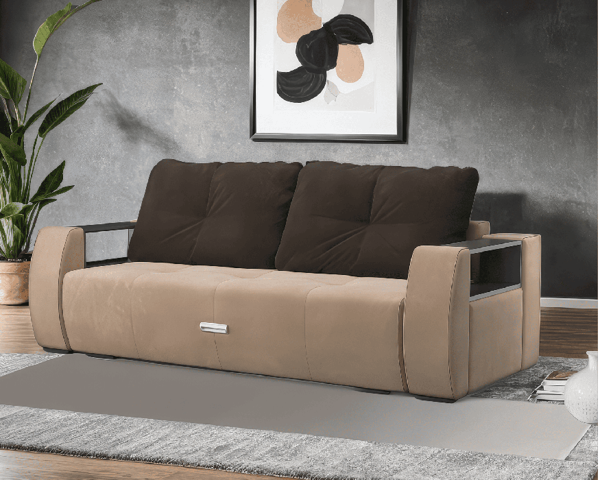 Отличительной особенностью дивана «Мальтида» выступает наличие каркасных подлокотников, образующих дополнительные подставки, что удобно для любителей пить кофе перед просмотром телевизора.