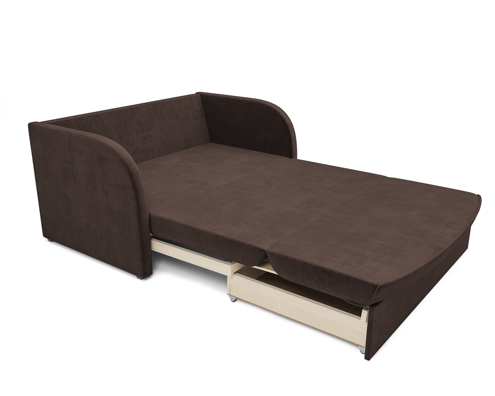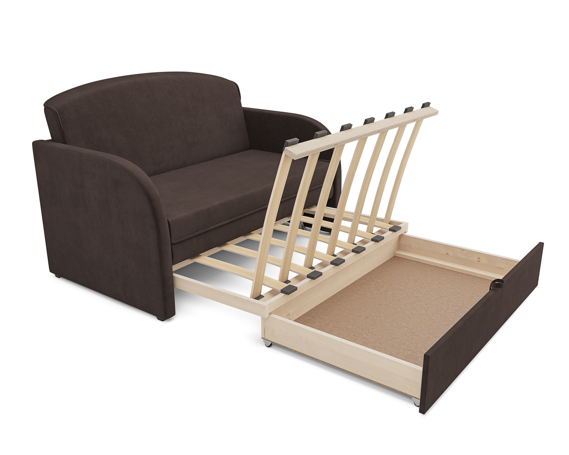 Выкатной механизм позволяет дивану «Малютка» легко переключаться между зоной отдыха и местом для сна. Частое раскладывание дивана в спальное место не портит механизм. Пластиковые ножки не царапают пол.