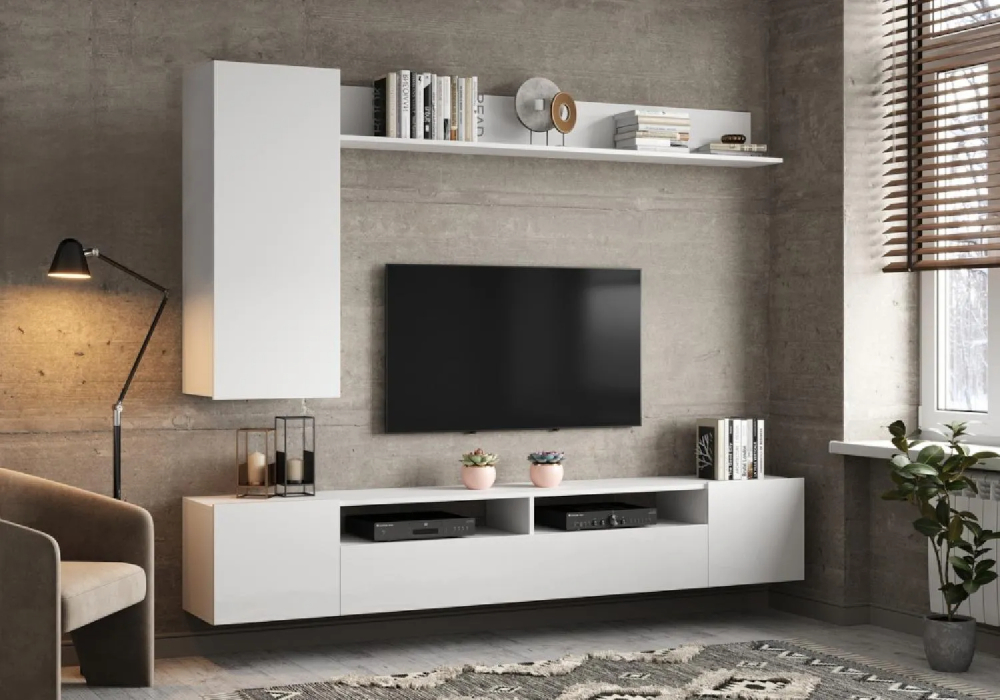 Стенка Соло-16 оснащена всем необходимым для комфортного отдыха и проведения досуга. Она включает в себя множество полок и ящиков для хранения различных предметов, а также место для телевизора.