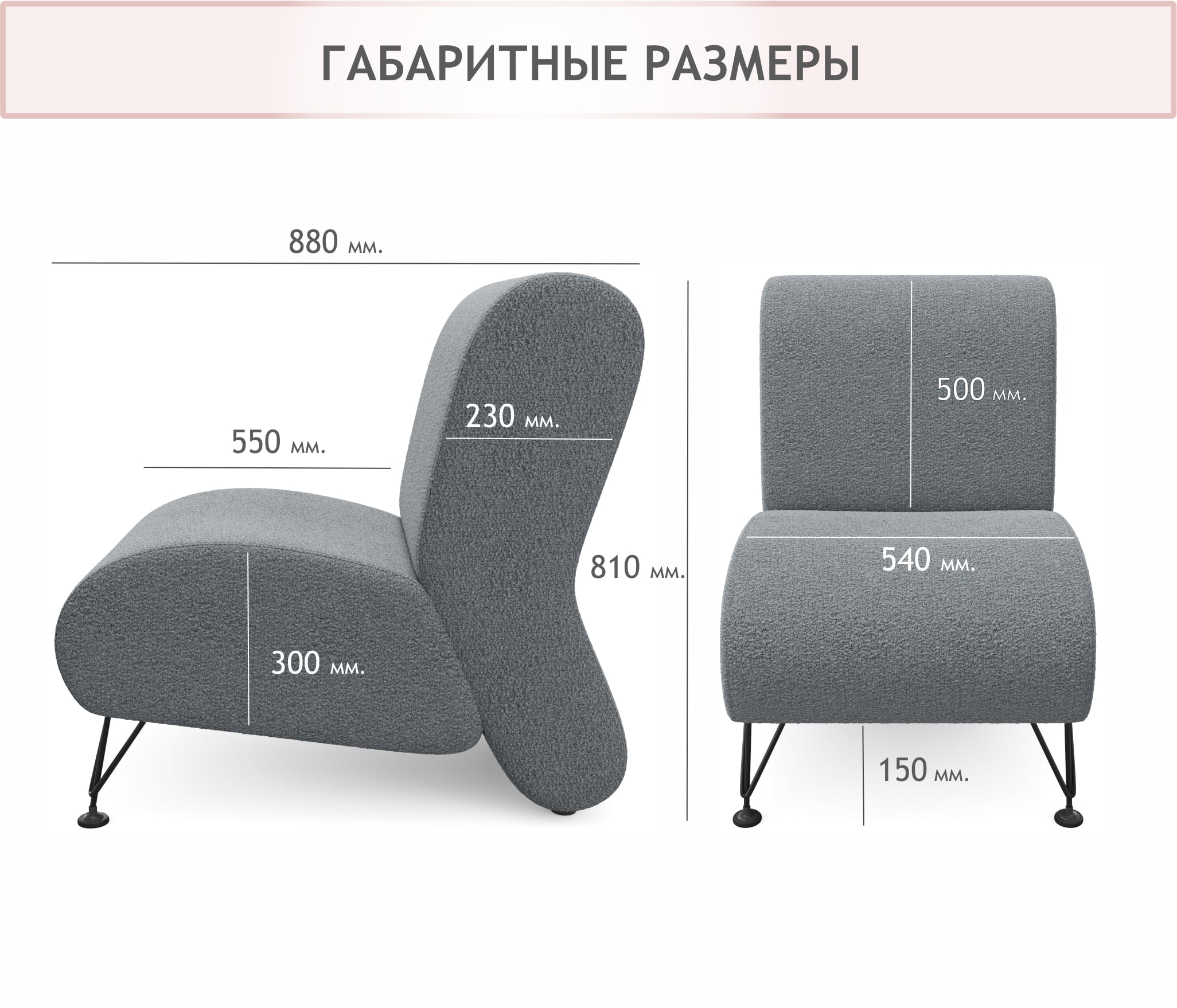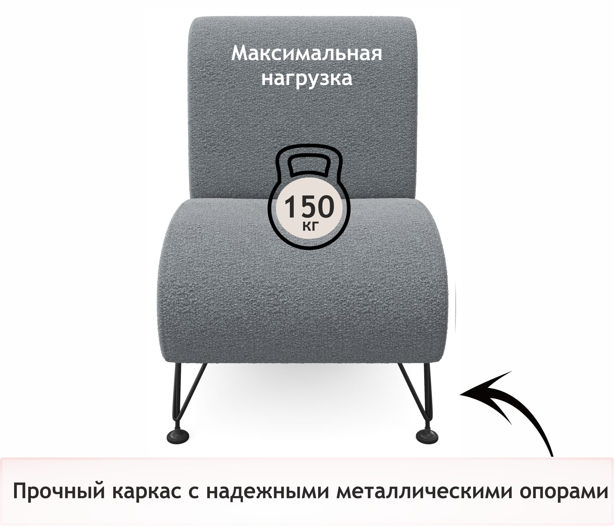 Мягкое интерьерное кресло может быть выполнено в различных цветовых вариантах из модного материала - букле. Это очень мягкий, тактильный обивочный материал, который делает отдых в кресле максимально комфортным. Высокое качество обивки позволяет сохранять первоначальный вид кресла без потери качества и цвета очень долгое время.