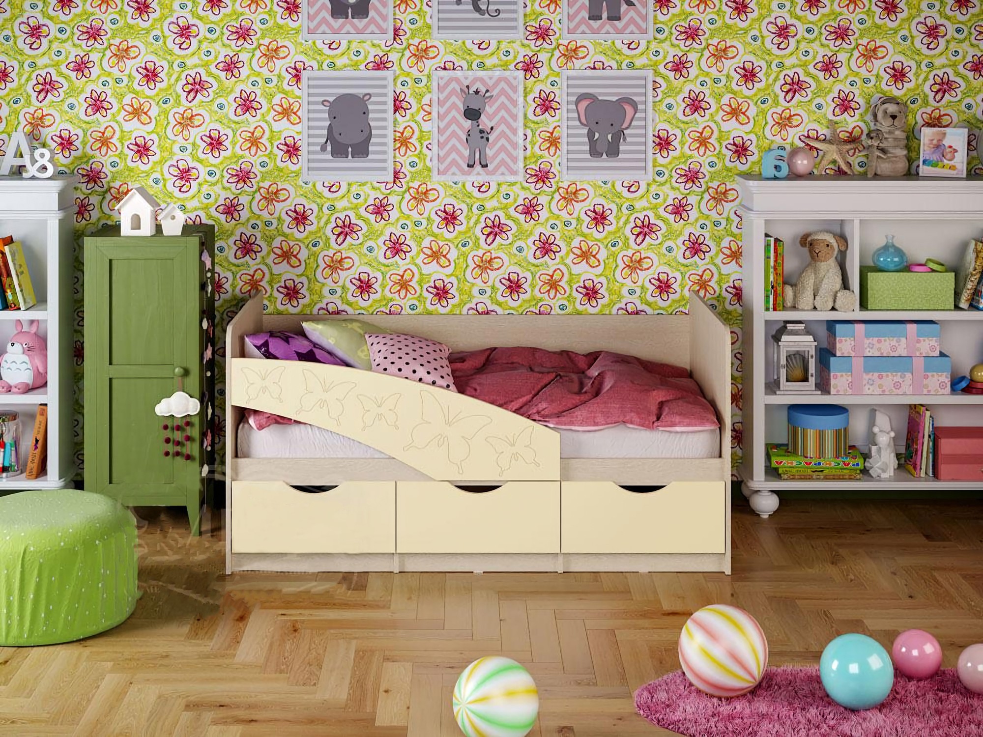 Детская кровать Бабочки недорогая, красивая и практичная модель в современном стиле. Выполнена из ЛДСП и ПВХ.