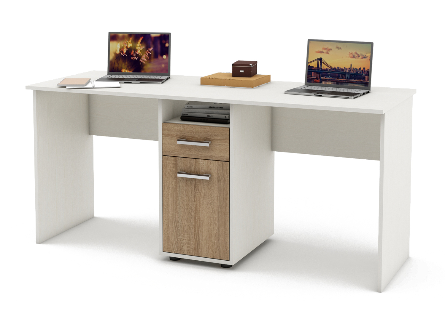 Письменный стол для двоих Остин-7 с ящиком и полкой предлагает удобное рабочее пространство для двух человек. Идеально подходит для организации работы и хранения вещей.