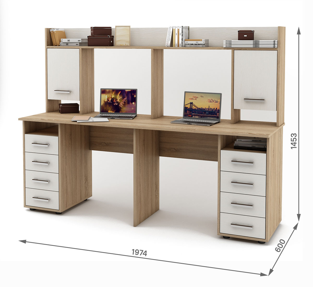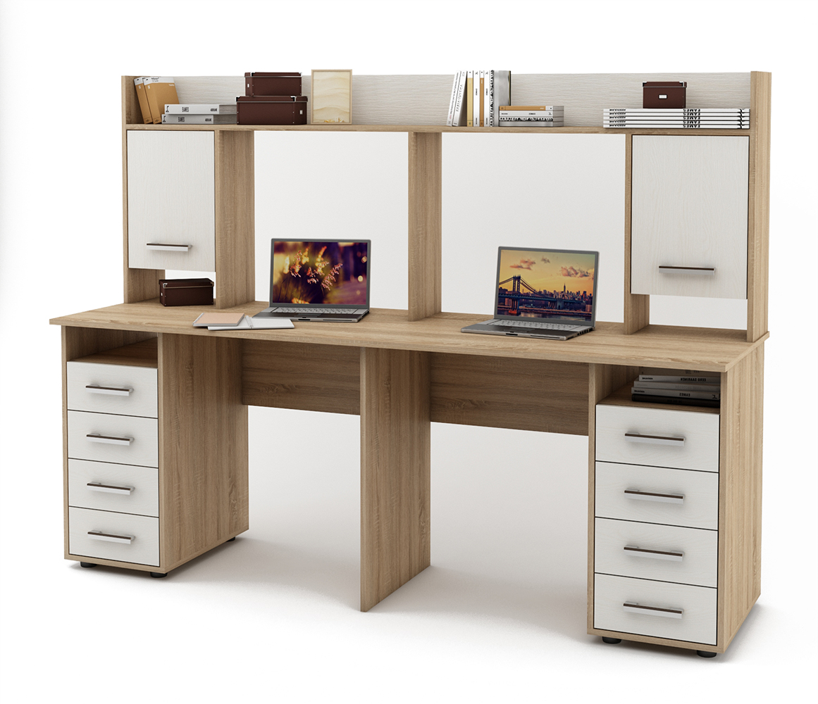 Письменный стол для двоих Остин-20 с надстройкой - идеальное решение для пары. Имеет достаточное количество ящиков и полок для хранения и организации рабочего пространства.