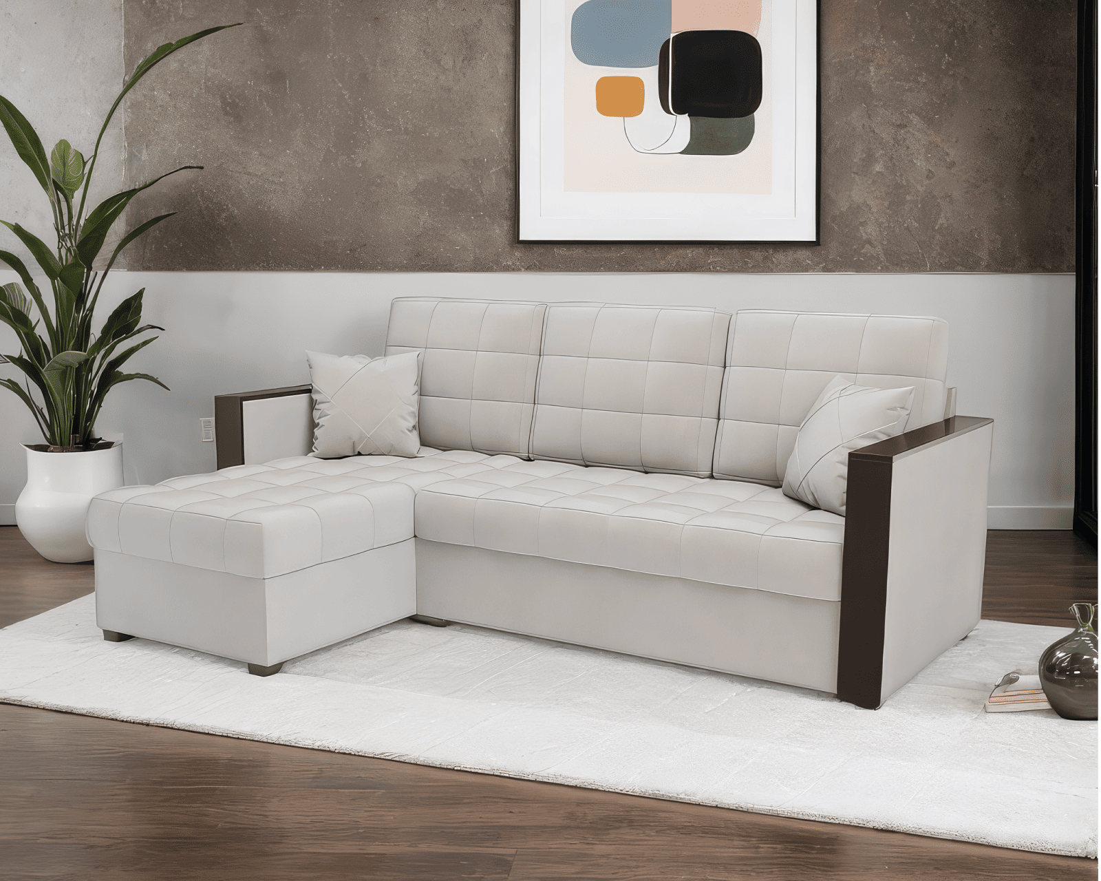 Особую утонченность угловому дивану «Техас» добавляют прямые подлокотники, обшитые деревянной накладкой из ЛДСП в цвете темного Венге. Деревянные подлокотники понравятся любителям забраться на диван с чашечкой ароматного кофе.