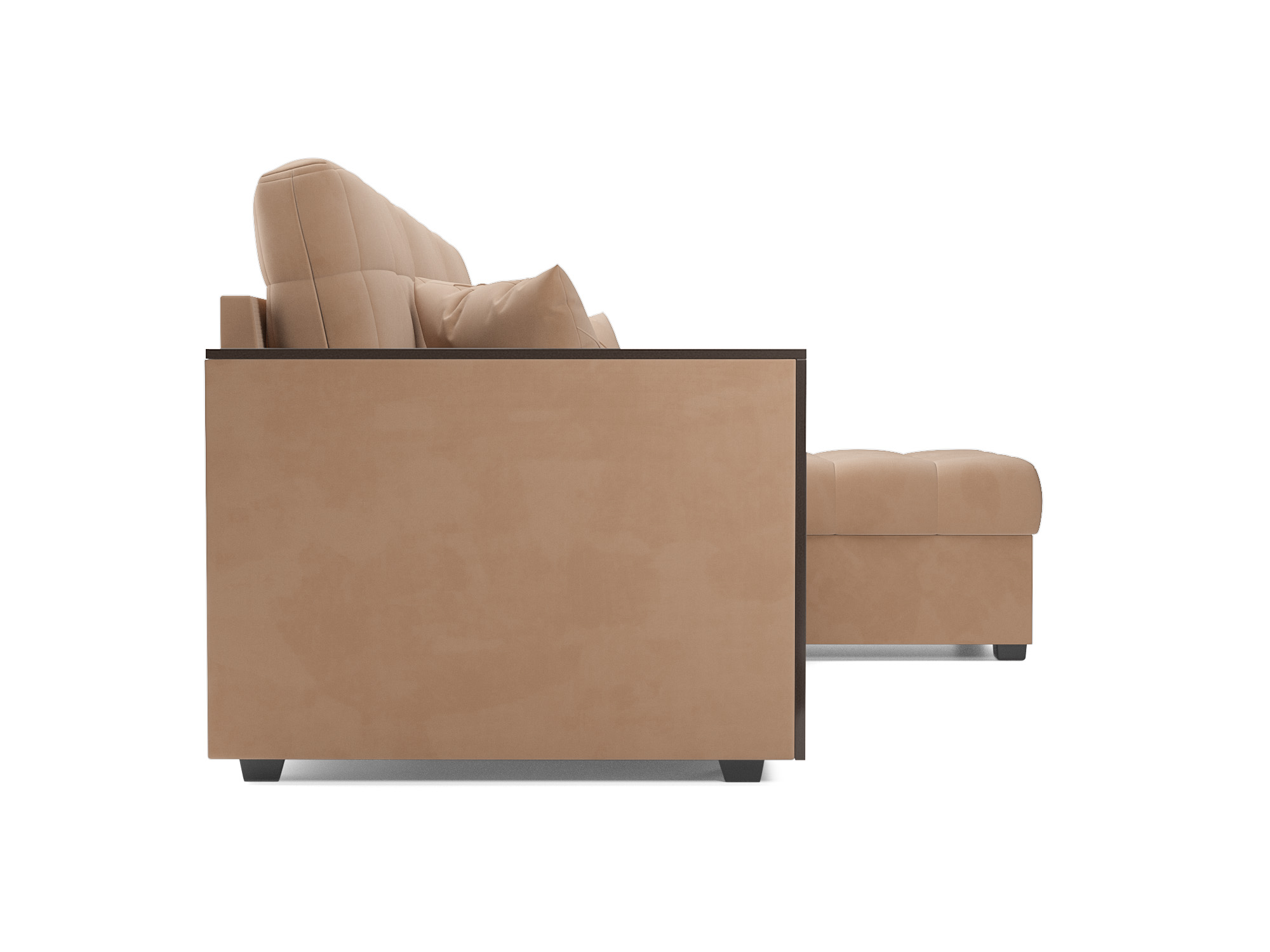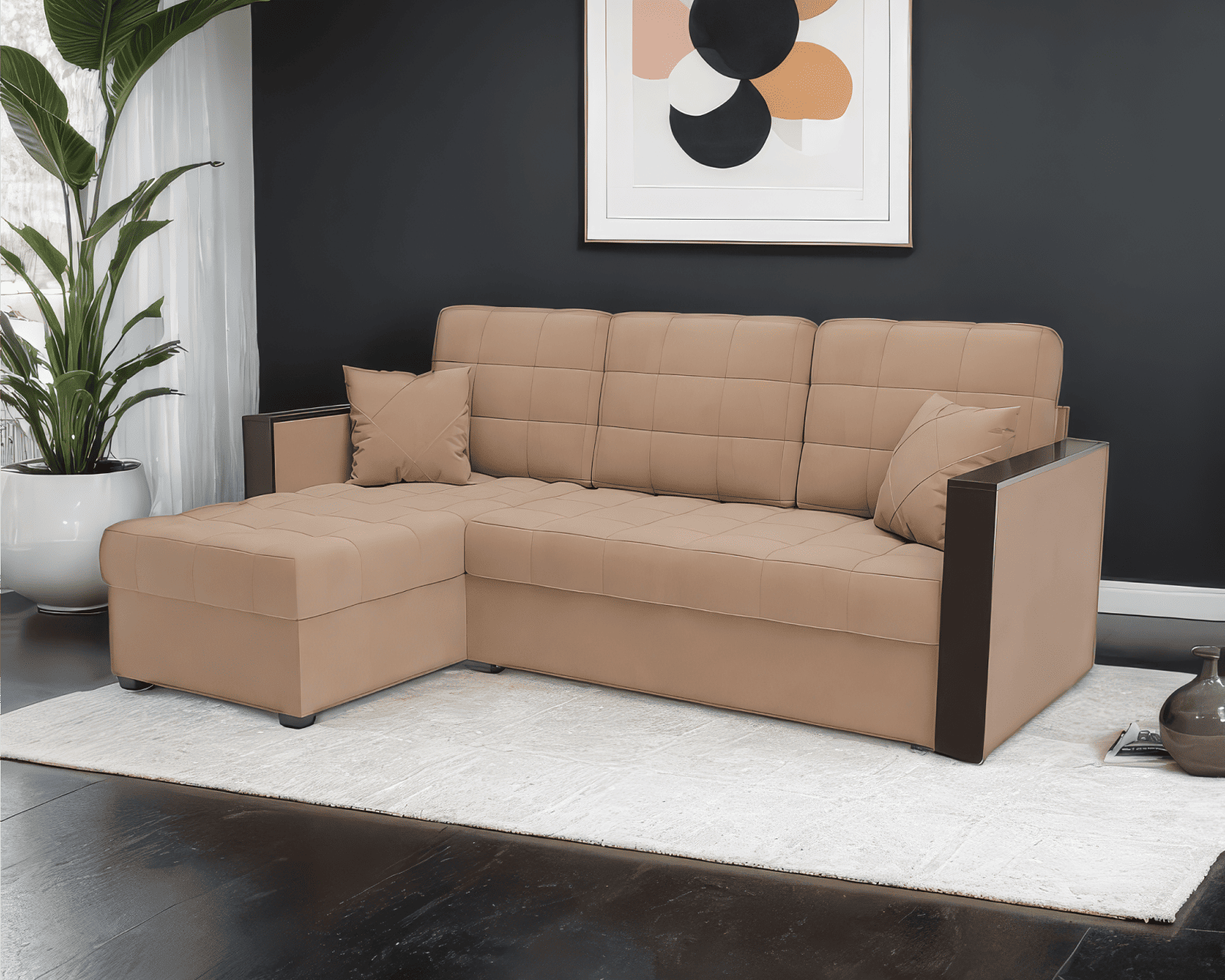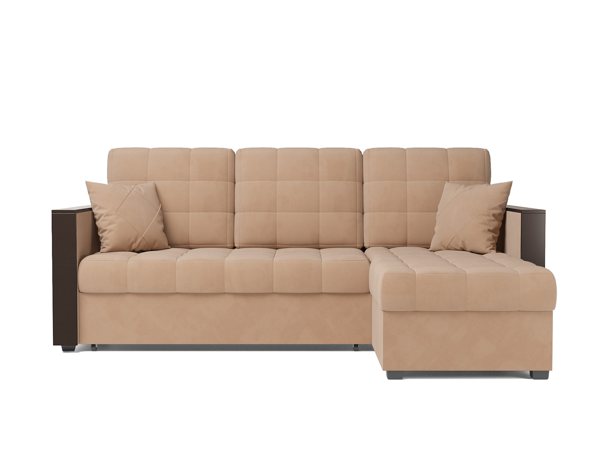 Особую утонченность угловому дивану «Техас» добавляют прямые подлокотники, обшитые деревянной накладкой из ЛДСП в цвете темного Венге. Деревянные подлокотники понравятся любителям забраться на диван с чашечкой ароматного кофе.