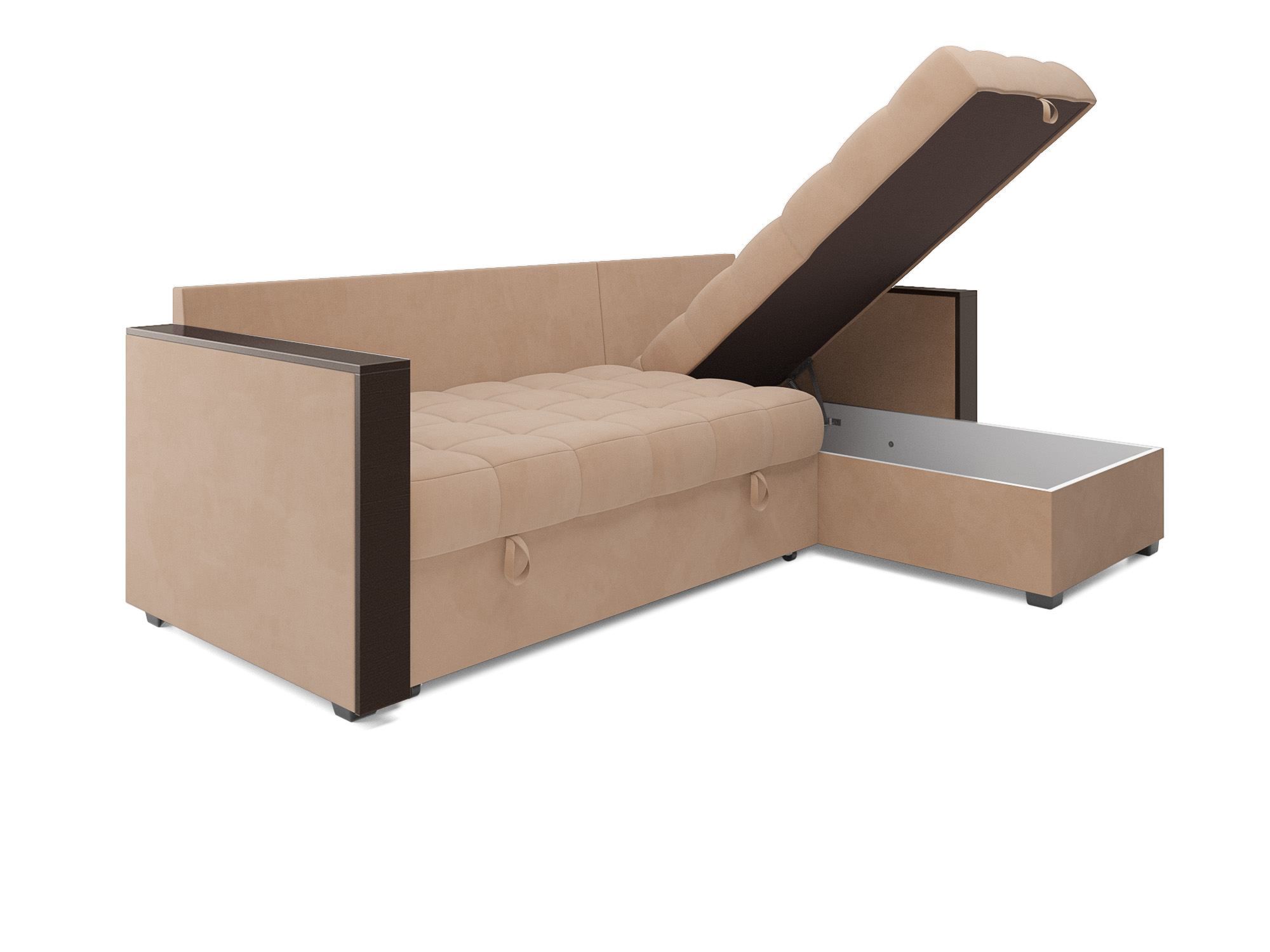 Удобство использования дивана «Техас» дополняется ящиком для хранения, который расположен внутри угловой части. В него можно положить небольшие вещи или постельные принадлежности, сохраняя порядок и экономя пространство.