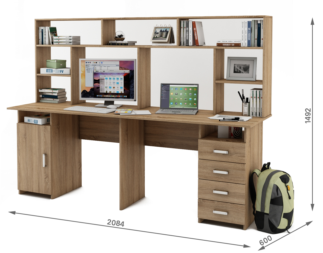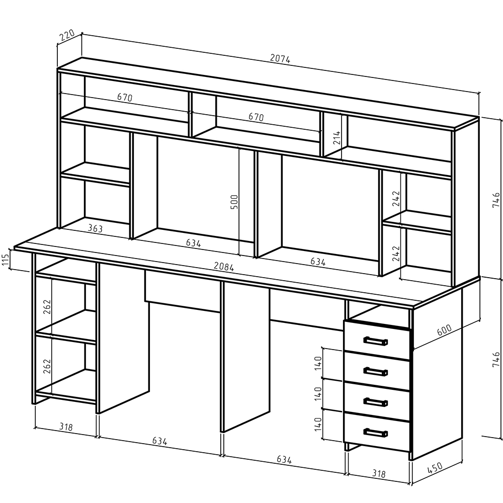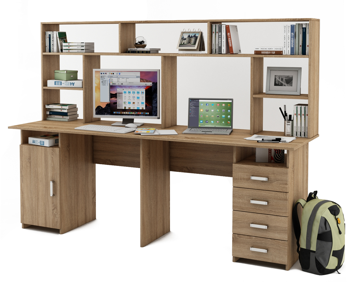 Удобный и стильный письменный стол Лайт-13 с надстройкой, обеспечивает двоим пользователям комфортное рабочее пространство. Имеет 4 просторных ящика для хранения различных предметов.