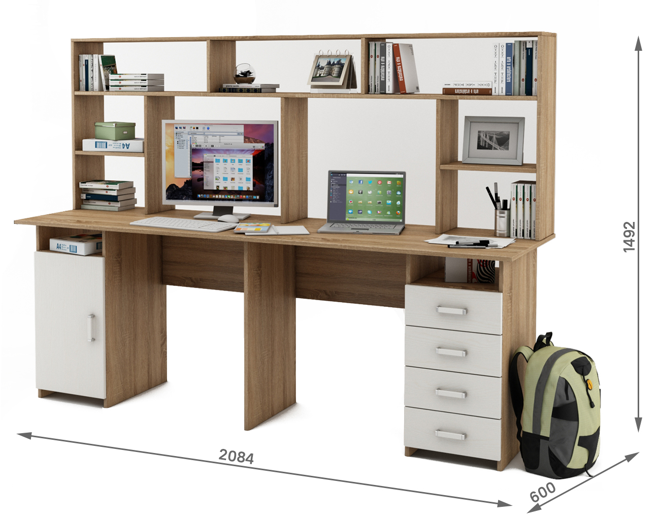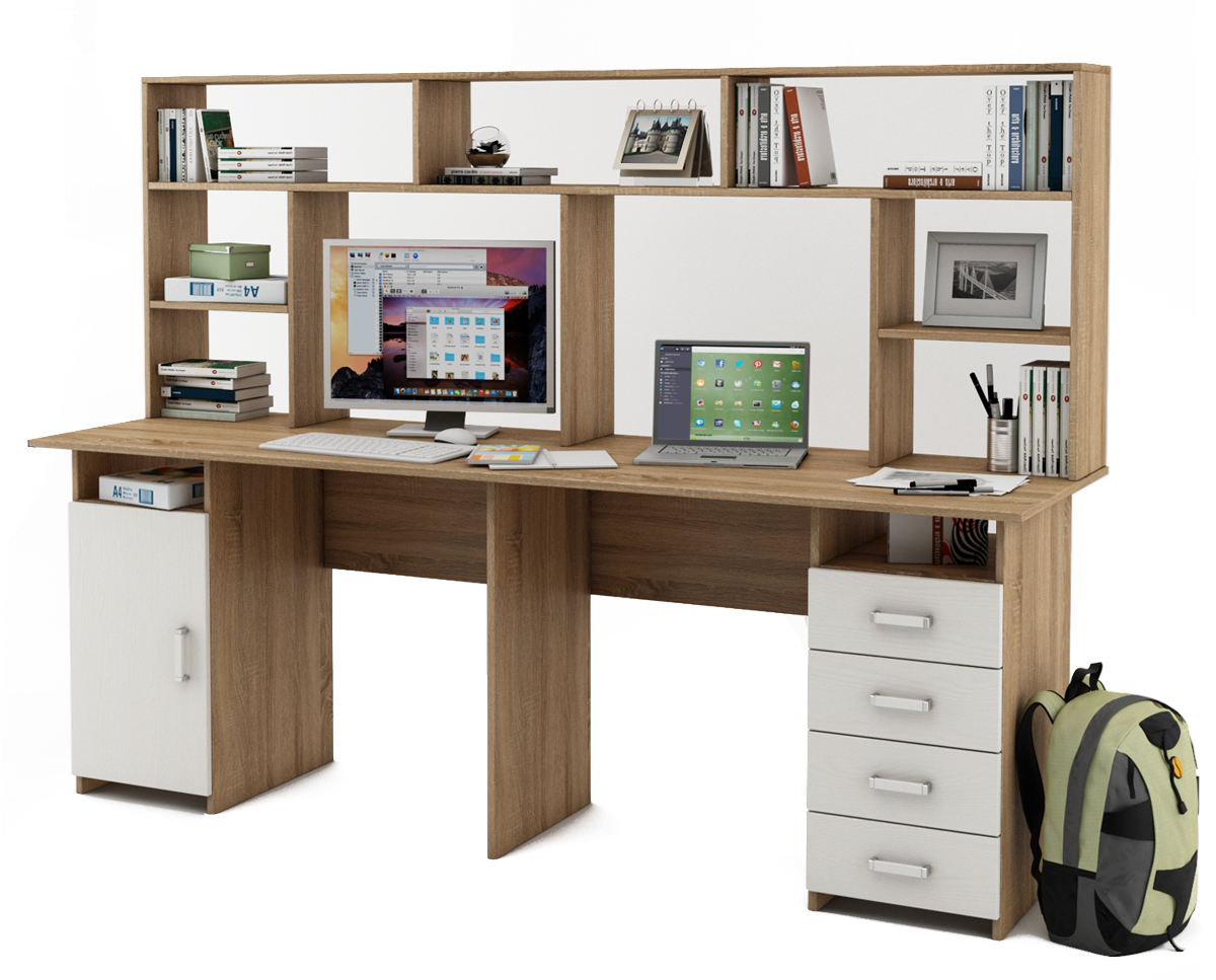 Удобный и стильный письменный стол Лайт-13 с надстройкой, обеспечивает двоим пользователям комфортное рабочее пространство. Имеет 4 просторных ящика для хранения различных предметов.
