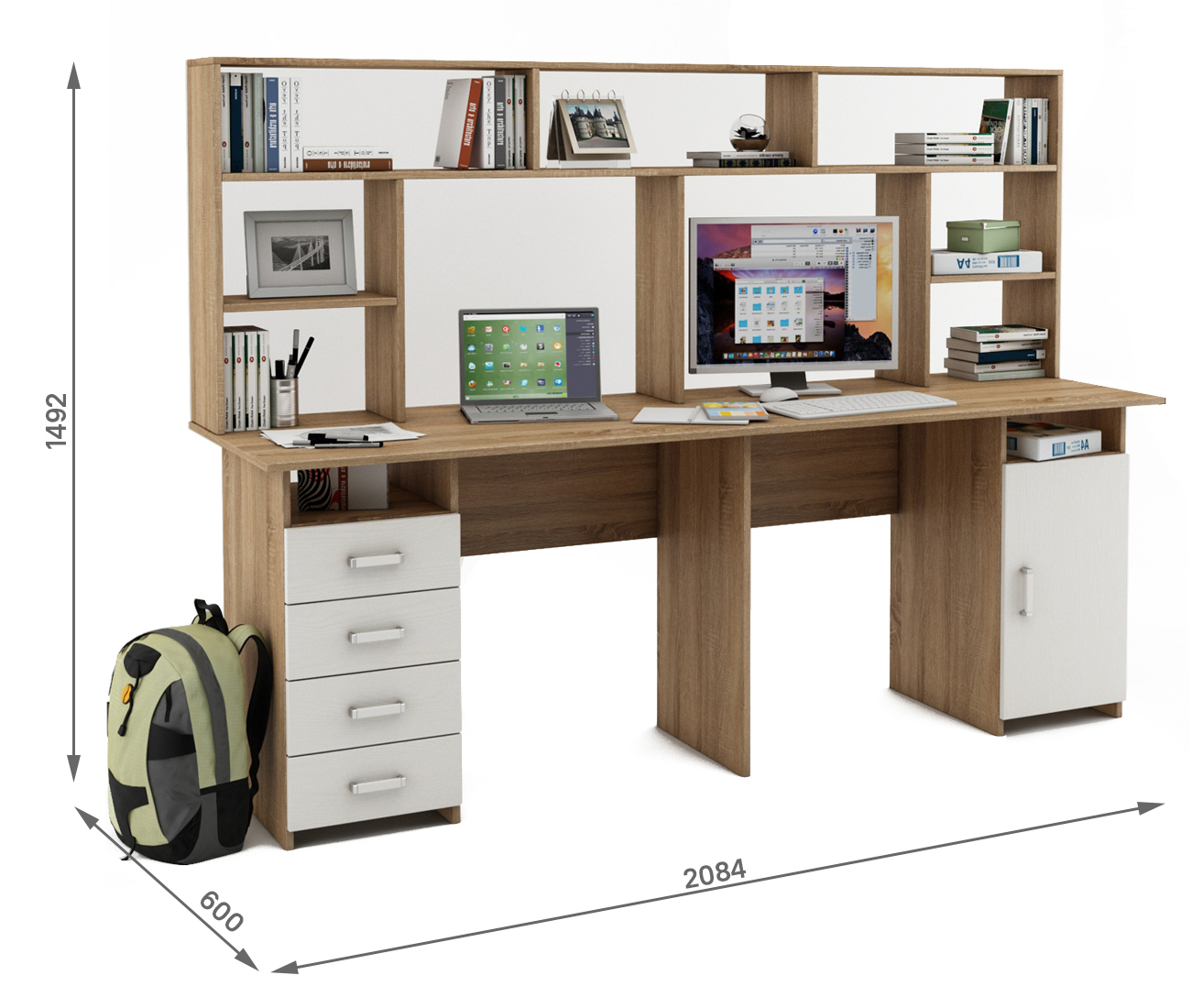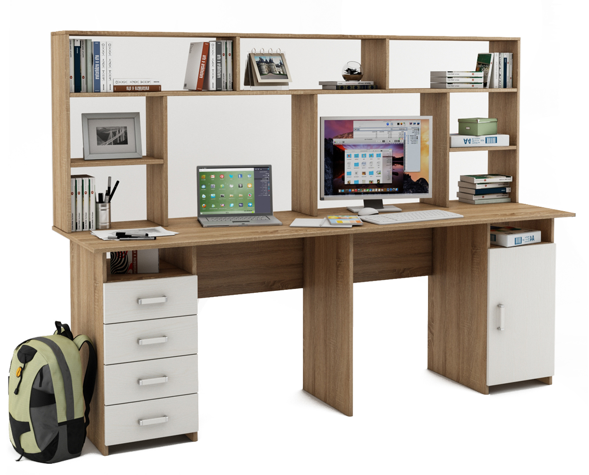 Удобный и стильный письменный стол Лайт-14 с надстройкой, обеспечивает двоим пользователям комфортное рабочее пространство. Имеет 4 просторных ящика для хранения различных предметов.