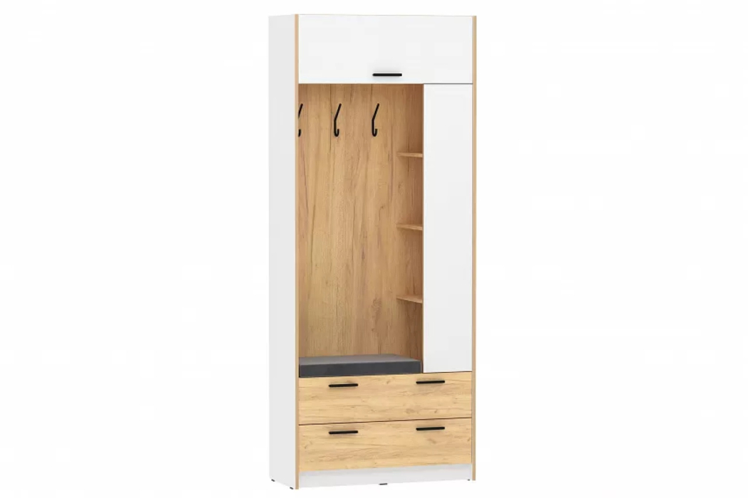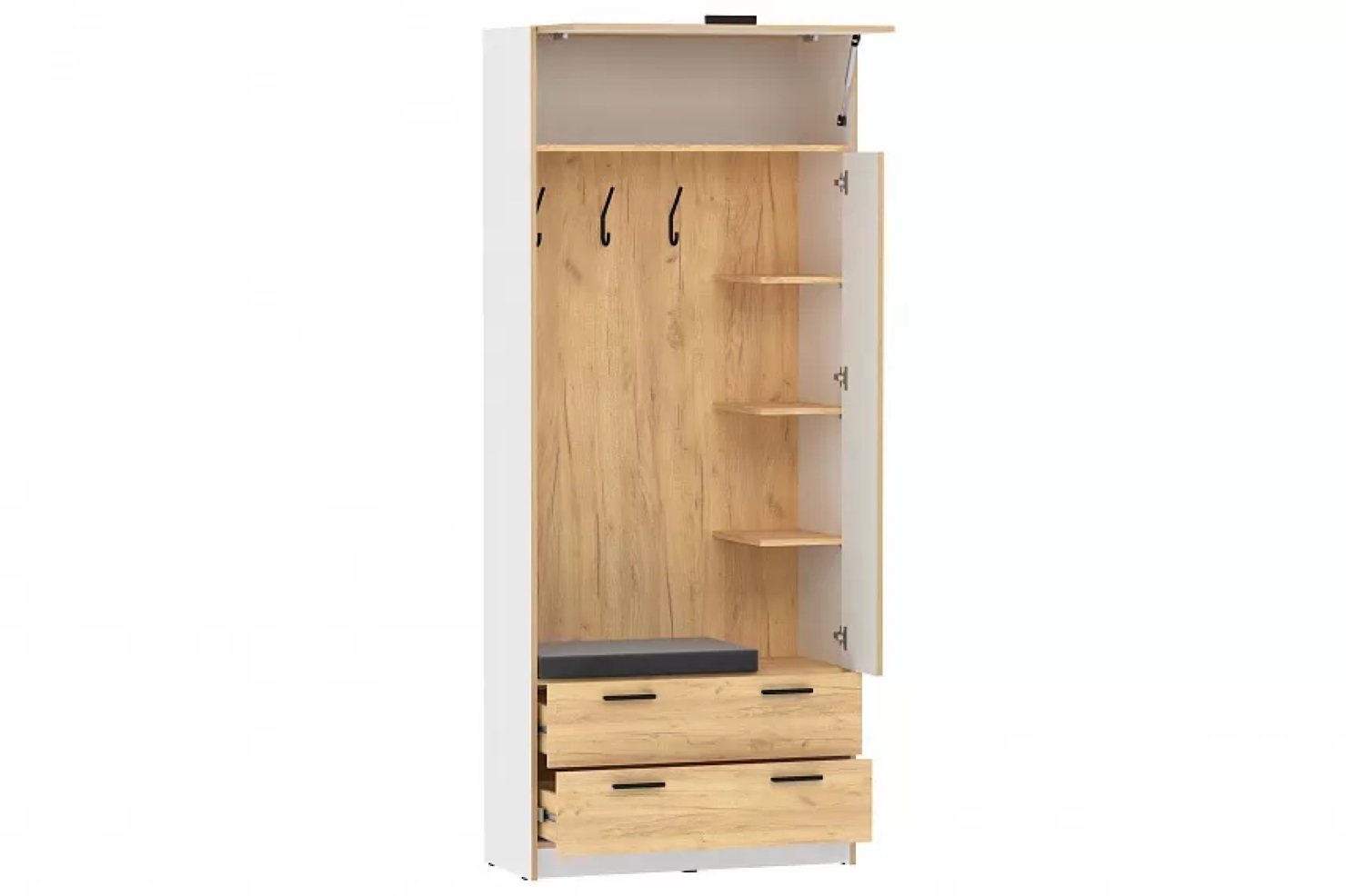 Модель оборудована дверкой, полочками и открытой вешалкой для одежды.