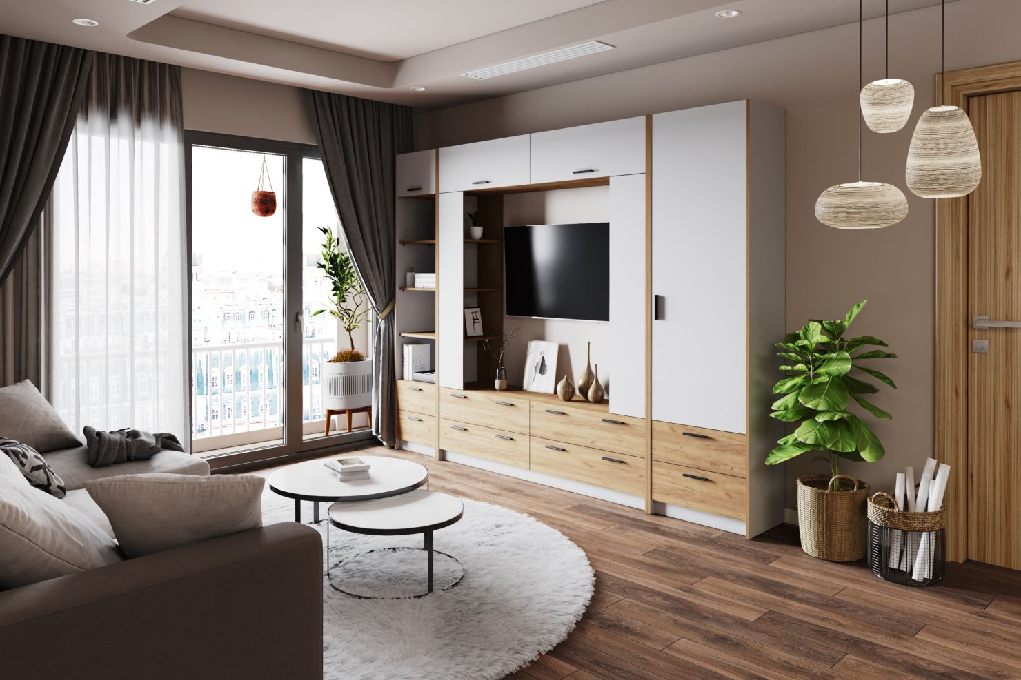 Стенка аккуратно разместит вещи, книги, телевизор, посуду.