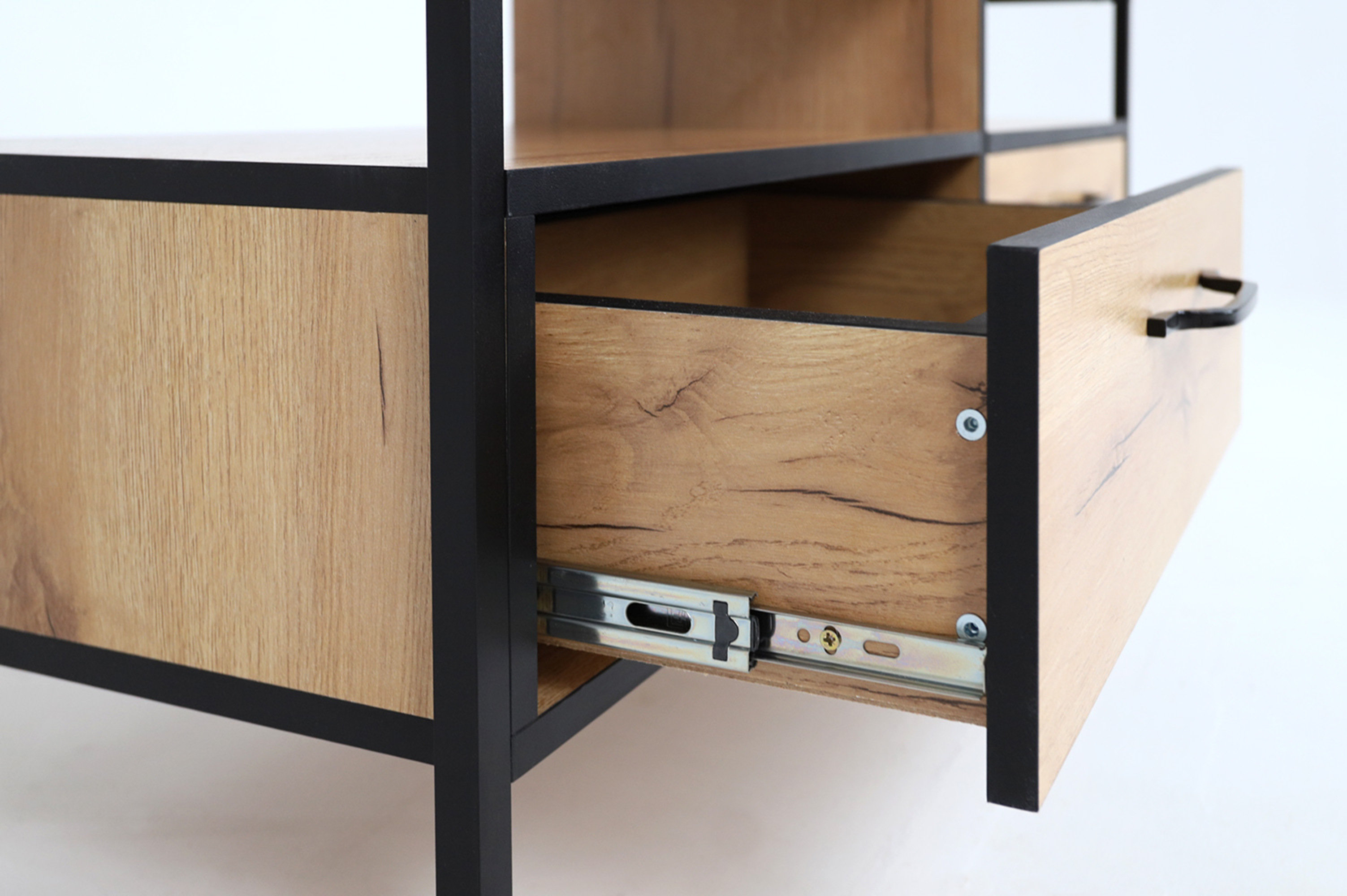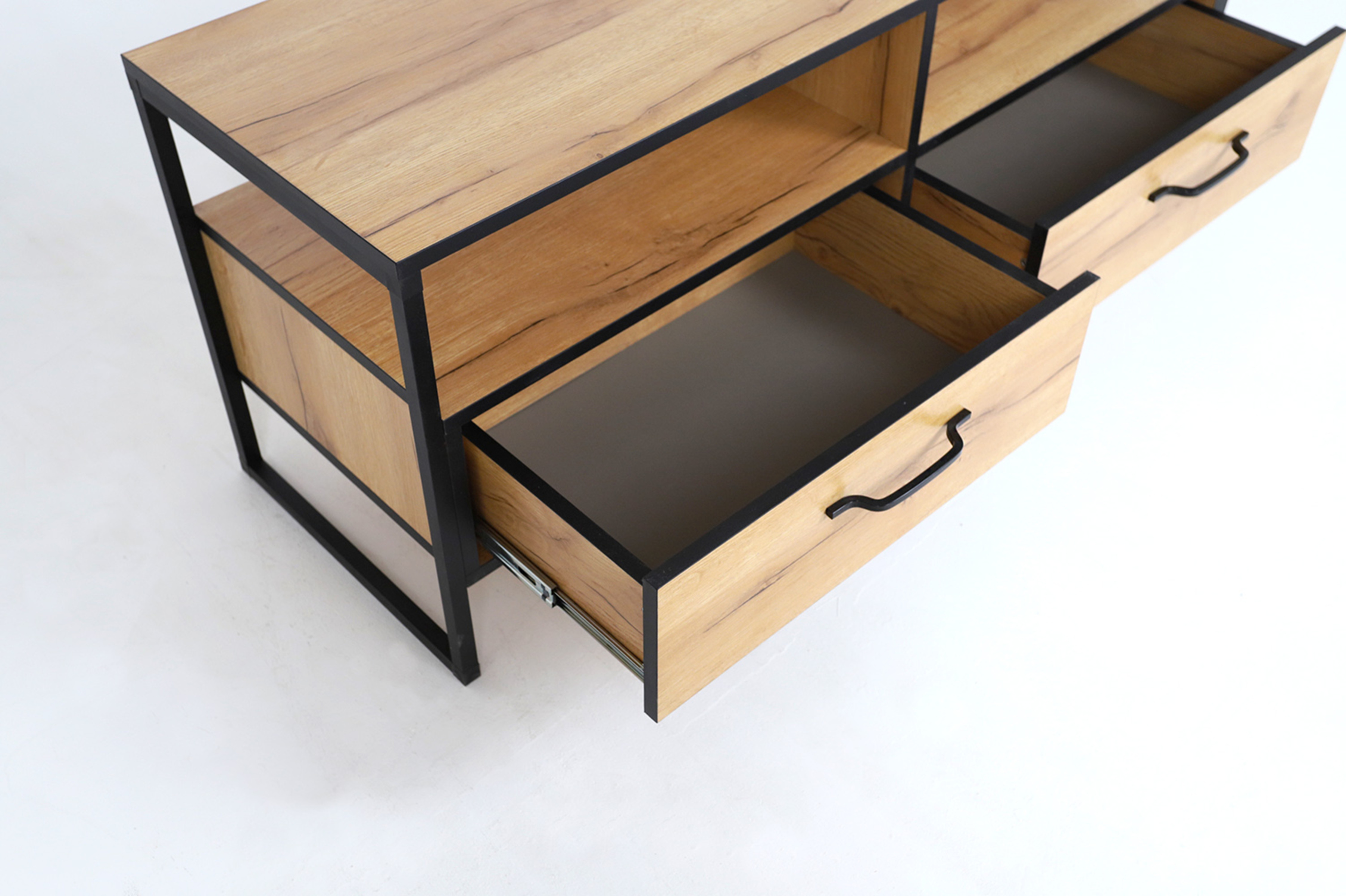 Тумба состоит из 2-х выкатных ящиков, шкафчика на петлях с доводчиком и имеет универсальную сборку.