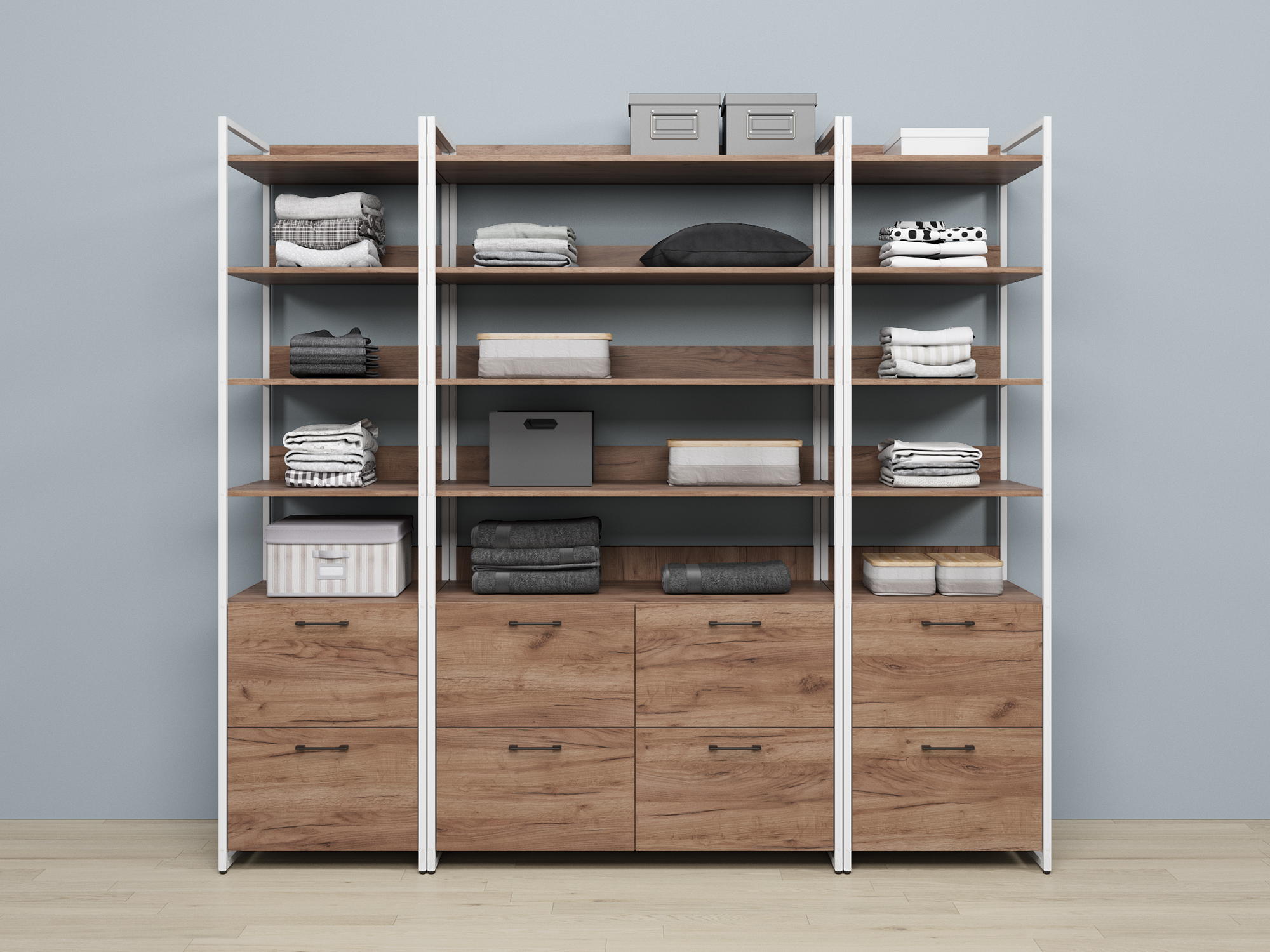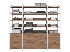 В комплект набора Urban 05 входит широкий стеллаж с полками и ящиками, а так же два узких стеллажа с полками и выдвижными ящиками. Каркас выполнен из металлического профиля 20х20 мм покрашенного порошковой краской, корпус и фасады из ЛДСП 16 мм. Каждый модуль имеет пластиковые ножки регулируемые по высоте. Все изделия серии Urban Лофт отлично комбинируются друг с другом и идеально подойдут для гардеробной, прихожей или офиса.