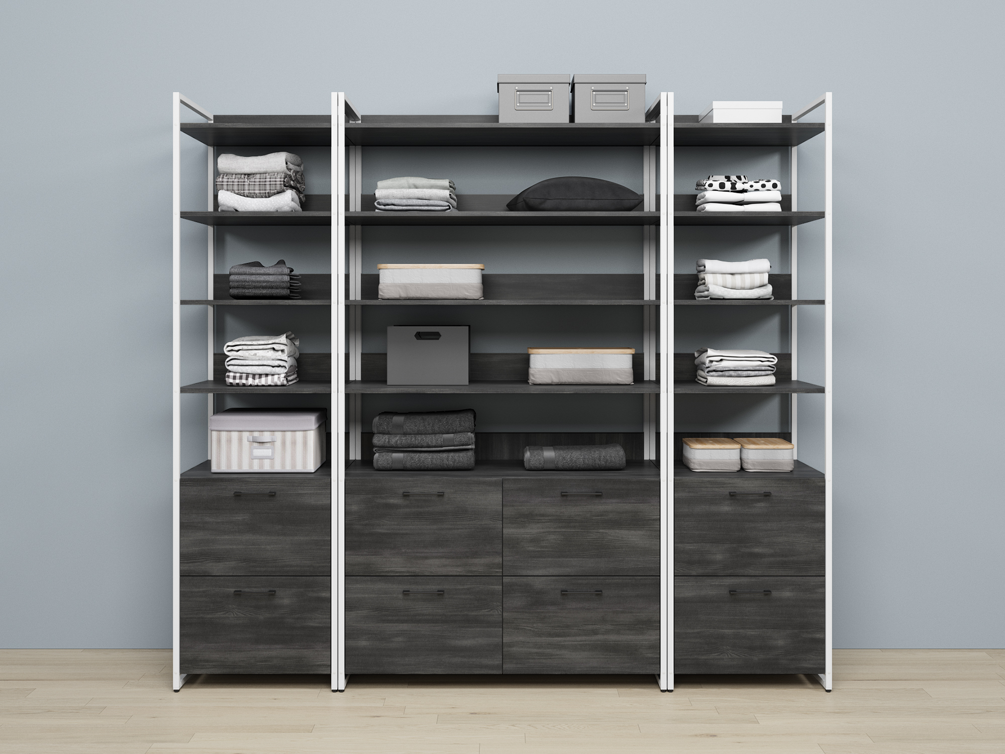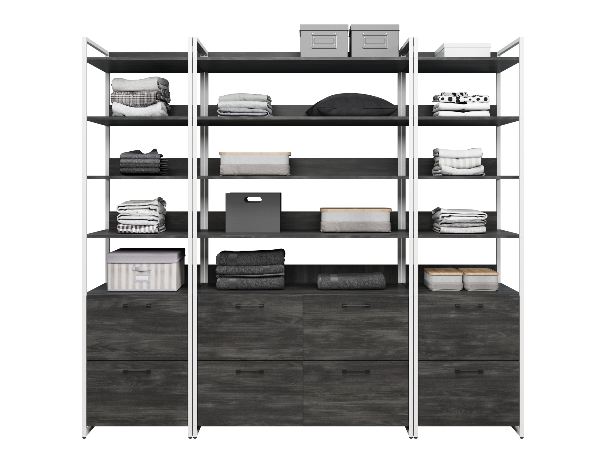 В комплект набора Urban 05 входит широкий стеллаж с полками и ящиками, а так же два узких стеллажа с полками и выдвижными ящиками. Каркас выполнен из металлического профиля 20х20 мм покрашенного порошковой краской, корпус и фасады из ЛДСП 16 мм. Каждый модуль имеет пластиковые ножки регулируемые по высоте. Все изделия серии Urban Лофт отлично комбинируются друг с другом и идеально подойдут для гардеробной, прихожей или офиса.