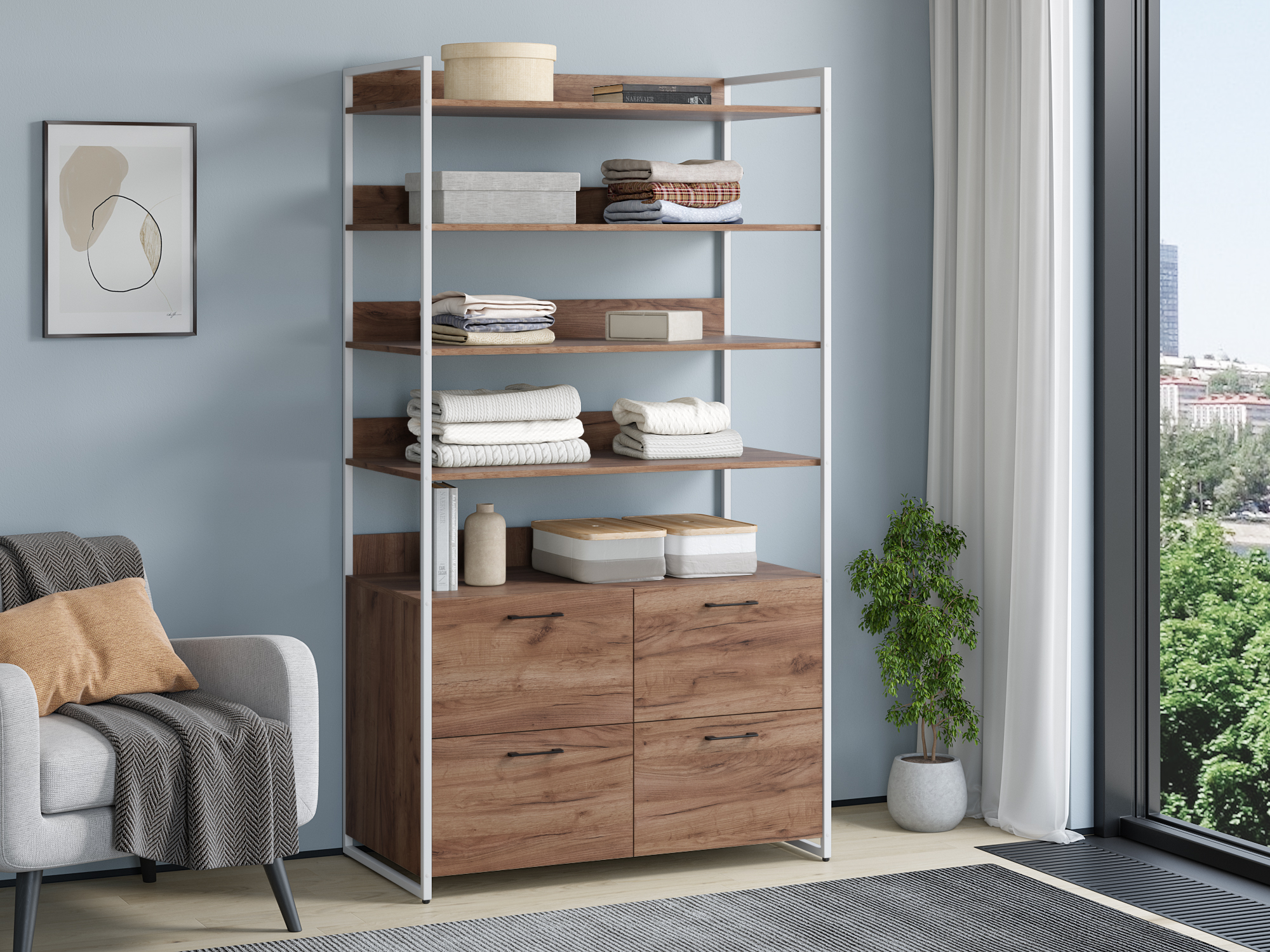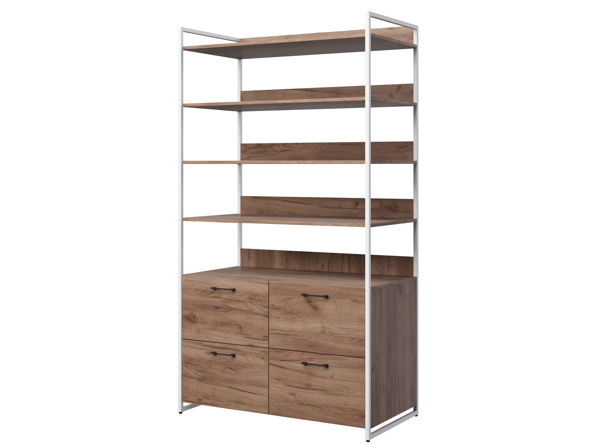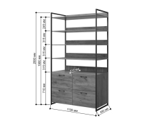 Стеллаж из серии Urban Лофт для хранения. Модель включает в себя пять открытых полок и четыре выдвижных ящика на напрвляющих для хранения вещей. Каркас выполнен из металлического профиля 20х20 мм, покрашенного порошковой краской. корпус и ящики из ЛДСП 16 мм. Все изделия серии Urban Лофт отлично комбинируются друг с другом и идеально подойдут для гардеробной, прихожей или офиса.