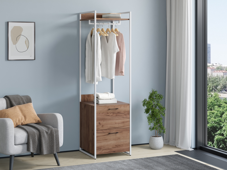 Стеллаж из серии Urban Лофт для хранения. Модель включает в себя штангу для вешалок и два ящика на направляющих для хранения вещей. Каркас выполнен из металлического профиля 20х20 мм, покрашенного порошковой краской. корпус и ящики из ЛДСП 16 мм. Стеллаж отлично комбинируется с другими моделями из серии Urban.