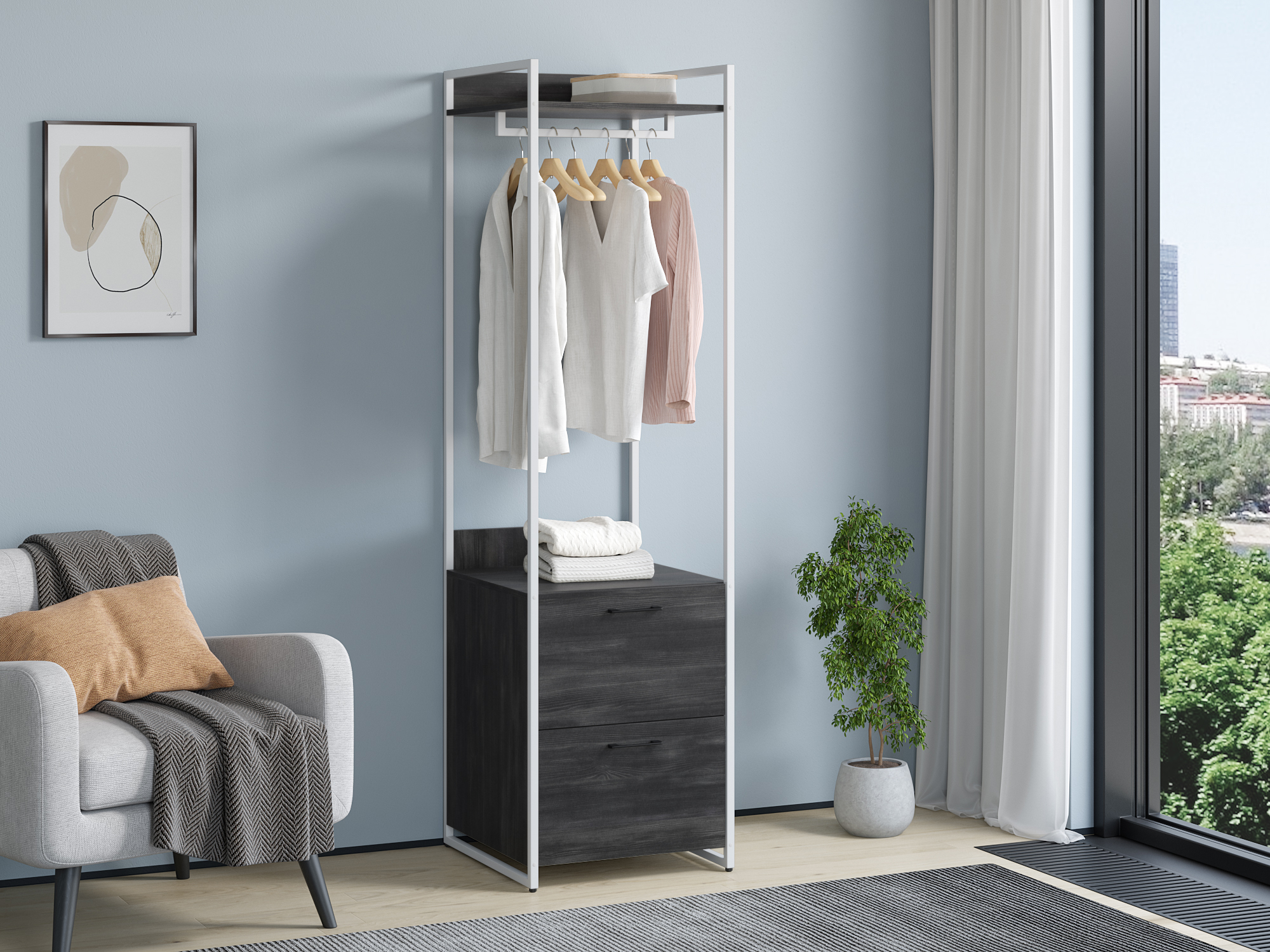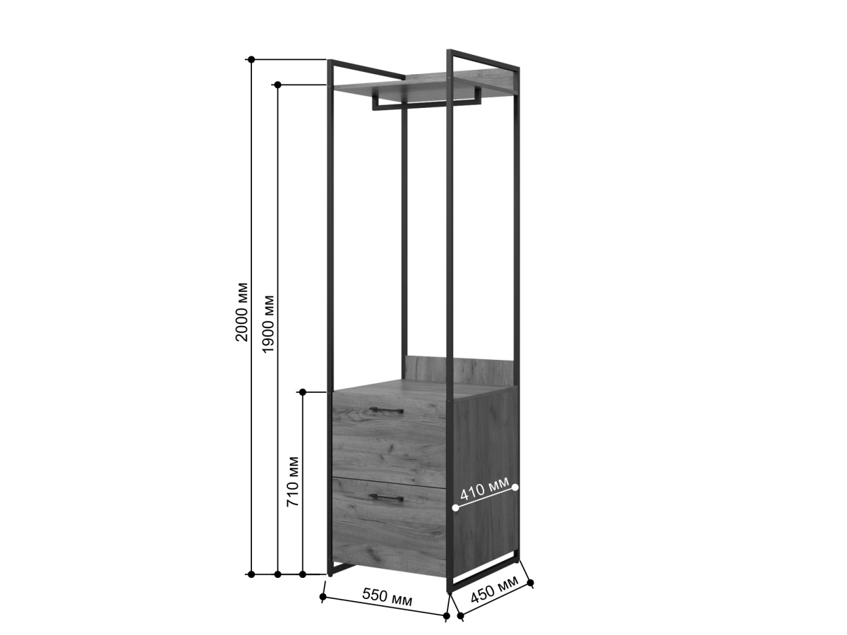 Стеллаж из серии Urban Лофт для хранения. Модель включает в себя штангу для вешалок и два ящика на направляющих для хранения вещей. Каркас выполнен из металлического профиля 20х20 мм, покрашенного порошковой краской. корпус и ящики из ЛДСП 16 мм. Стеллаж отлично комбинируется с другими моделями из серии Urban.
