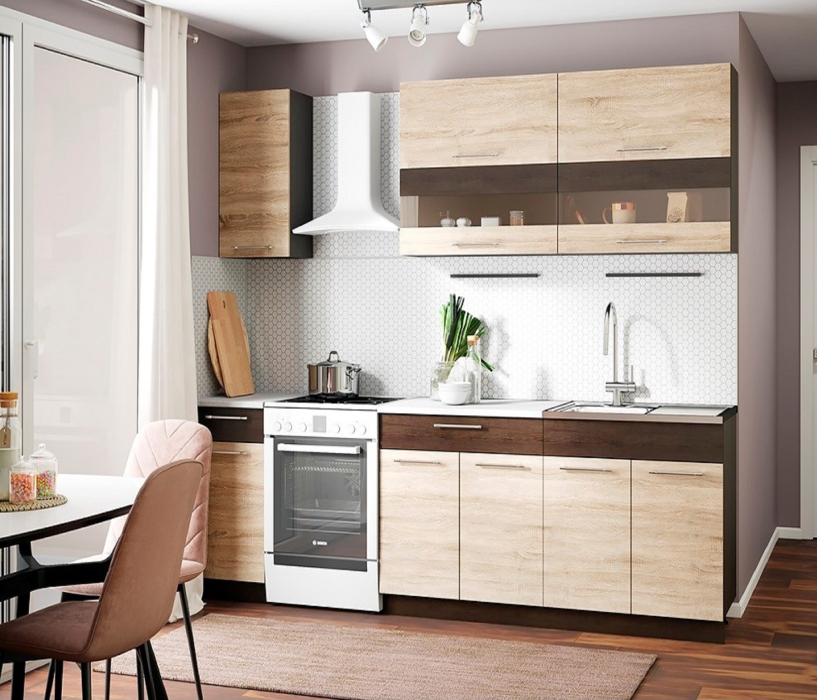 Гарнитур Маша шириной 2.0 м спроектирована для тех хозяек, которые мечтают готовить на удобной и стильной кухне. Верхние модули: ШВ 800, ШВ 800, ШВ 400 - (ВхГ) 71.5х30 см. Нижние модули: ШНМ 800, ШН1Я 800, ШН1Я 400 - (ВхГ) 84.5х52 см (высота указана с учётом столешницы)
