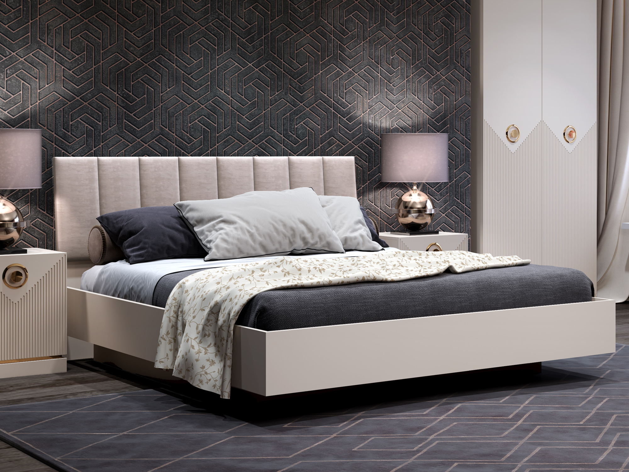 Кровать имеет длину 216,6 см и ширину 143,2 см, что делает ее достаточно просторной для комфортного сна. Высота изголовья составляет 106 см, что обеспечивает удобное положение головы во время отдыха.