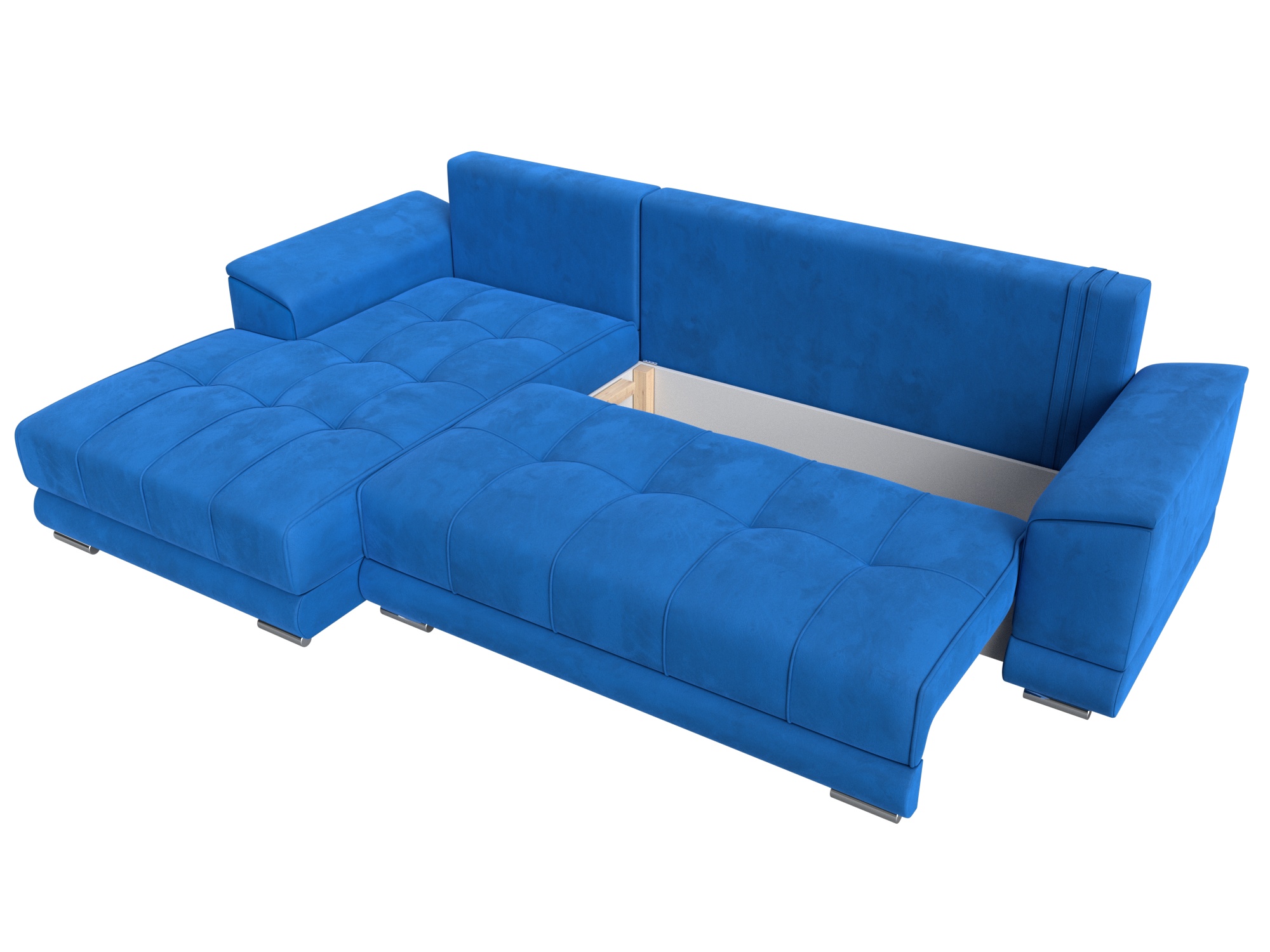 Механизм: еврокнижка. Нижняя часть углового дивана легко выдвигается на ножках-роликах, образуя нишу. В нее опускается установленная на кронштейны спинка.