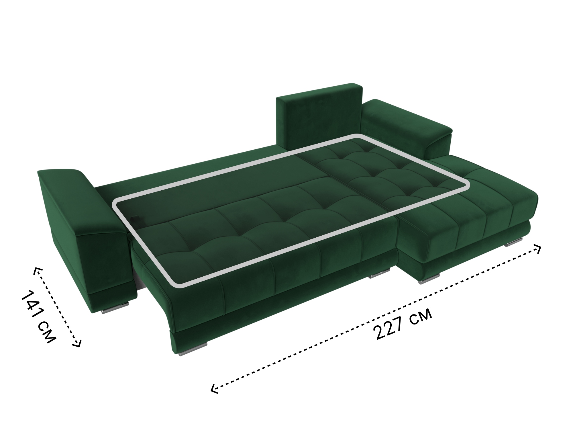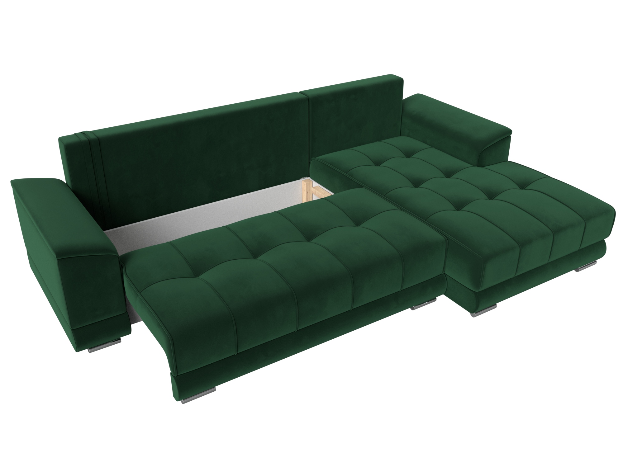 Механизм: еврокнижка. Нижняя часть углового дивана легко выдвигается на ножках-роликах, образуя нишу. В нее опускается установленная на кронштейны спинка.