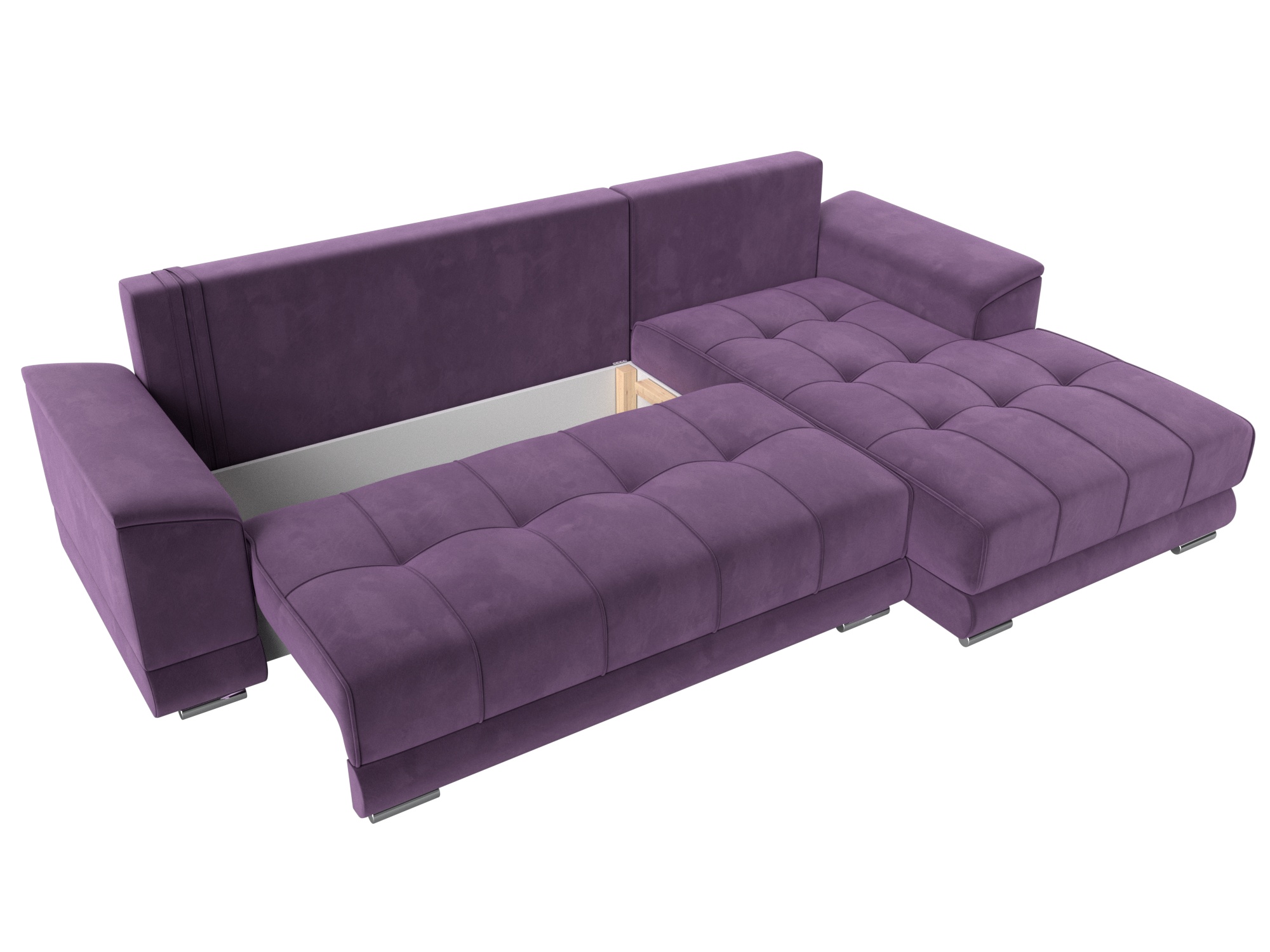 Механизм: еврокнижка. Нижняя часть углового дивана легко выдвигается на ножках-роликах, образуя нишу. В нее опускается установленная на кронштейны спинка.